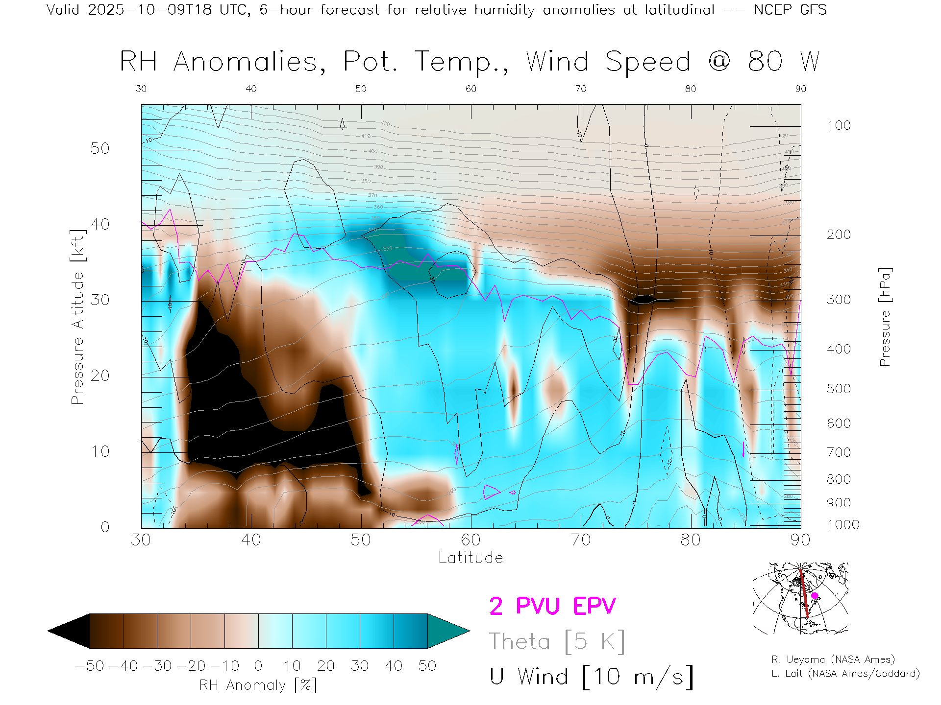 NCEP GFS Forecast Rel. Hum. X-Section (80 W)