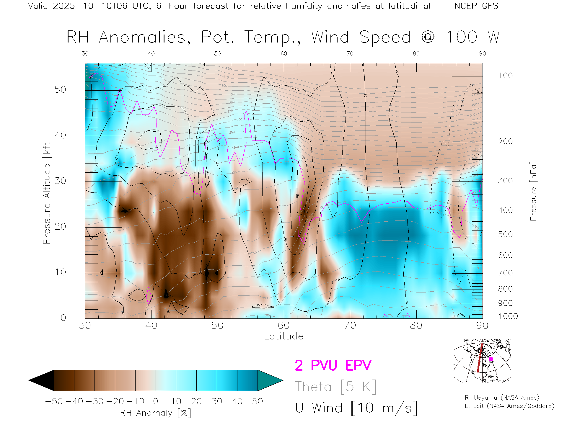 NCEP GFS Forecast Rel. Hum. X-Section (100 W)