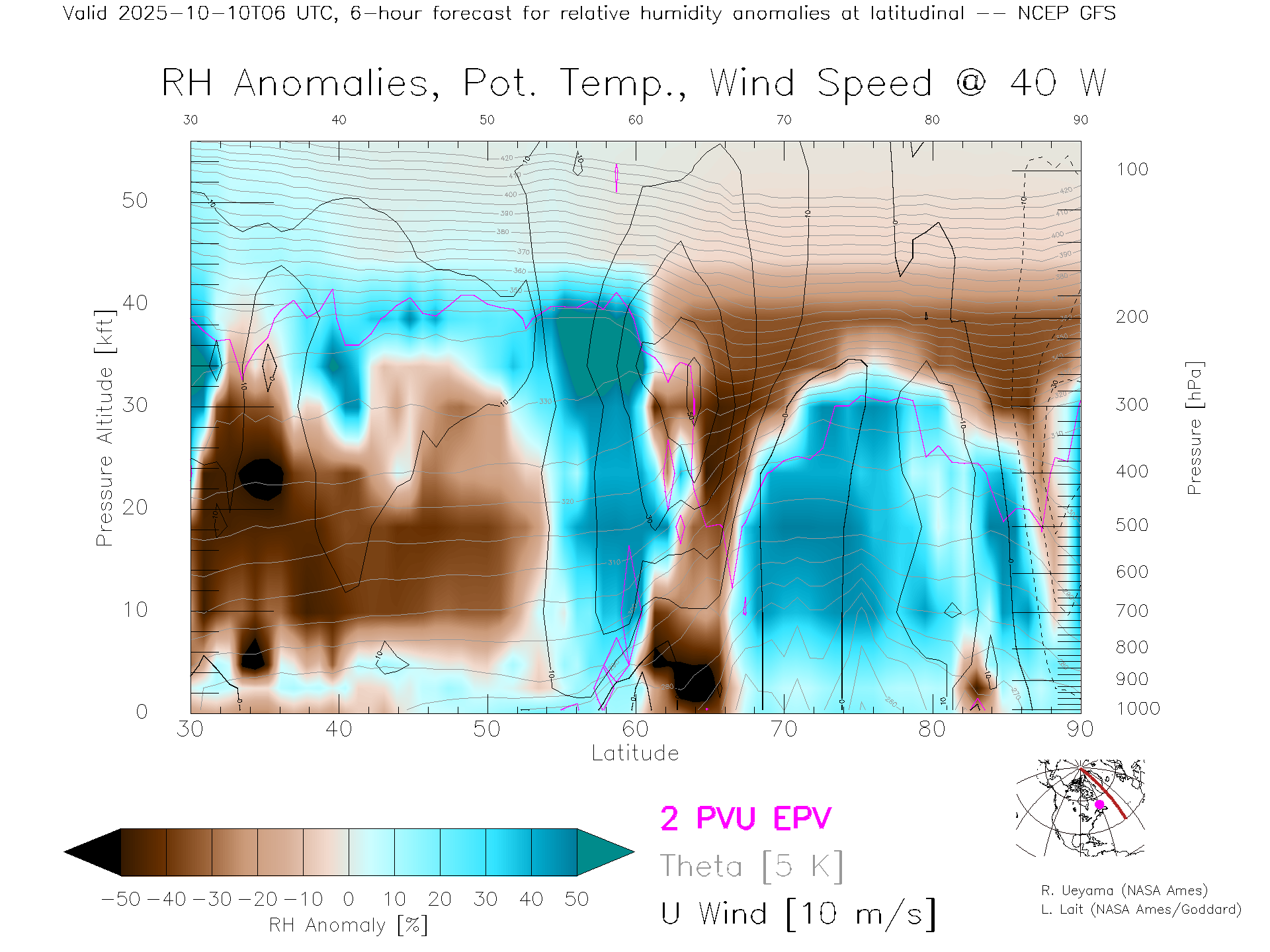 NCEP GFS Forecast Rel. Hum. X-Section (40 W)