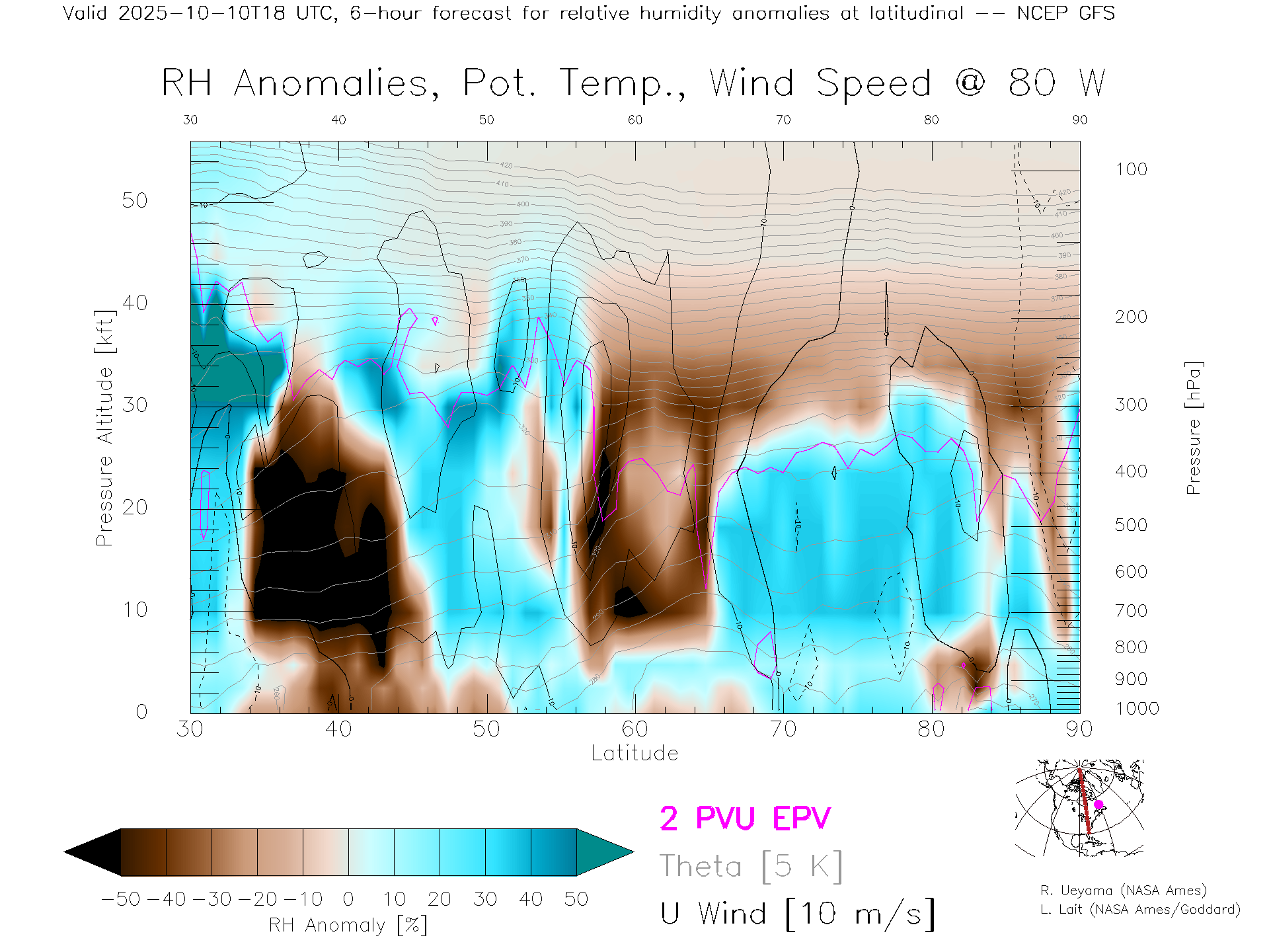 NCEP GFS Forecast Rel. Hum. X-Section (80 W)