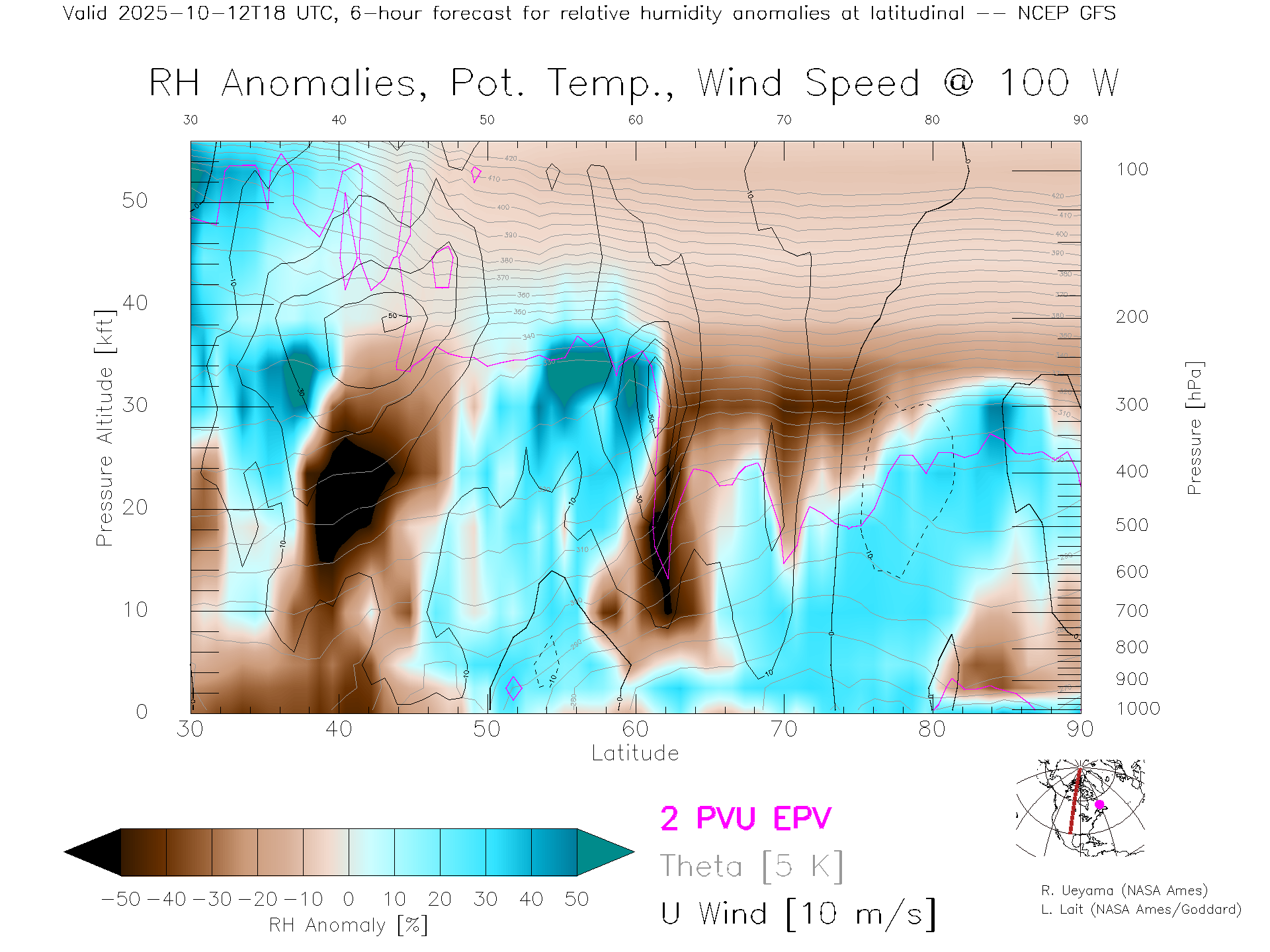NCEP GFS Forecast Rel. Hum. X-Section (100 W)