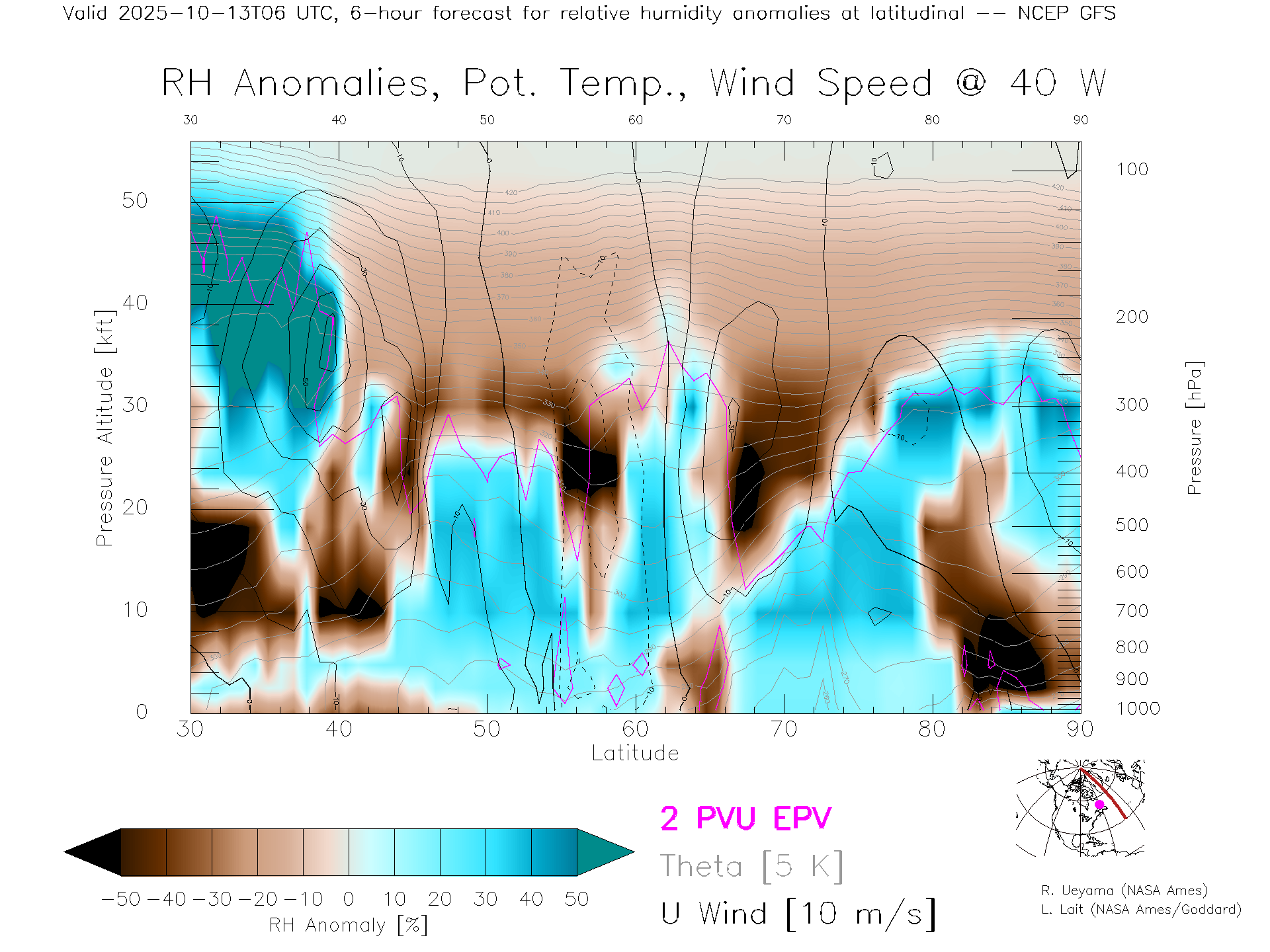 NCEP GFS Forecast Rel. Hum. X-Section (40 W)