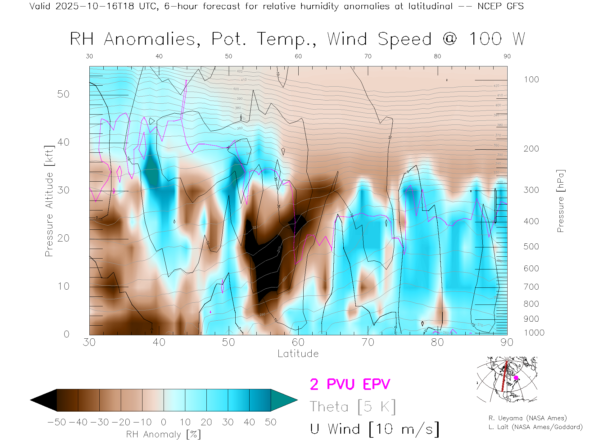 NCEP GFS Forecast Rel. Hum. X-Section (100 W)
