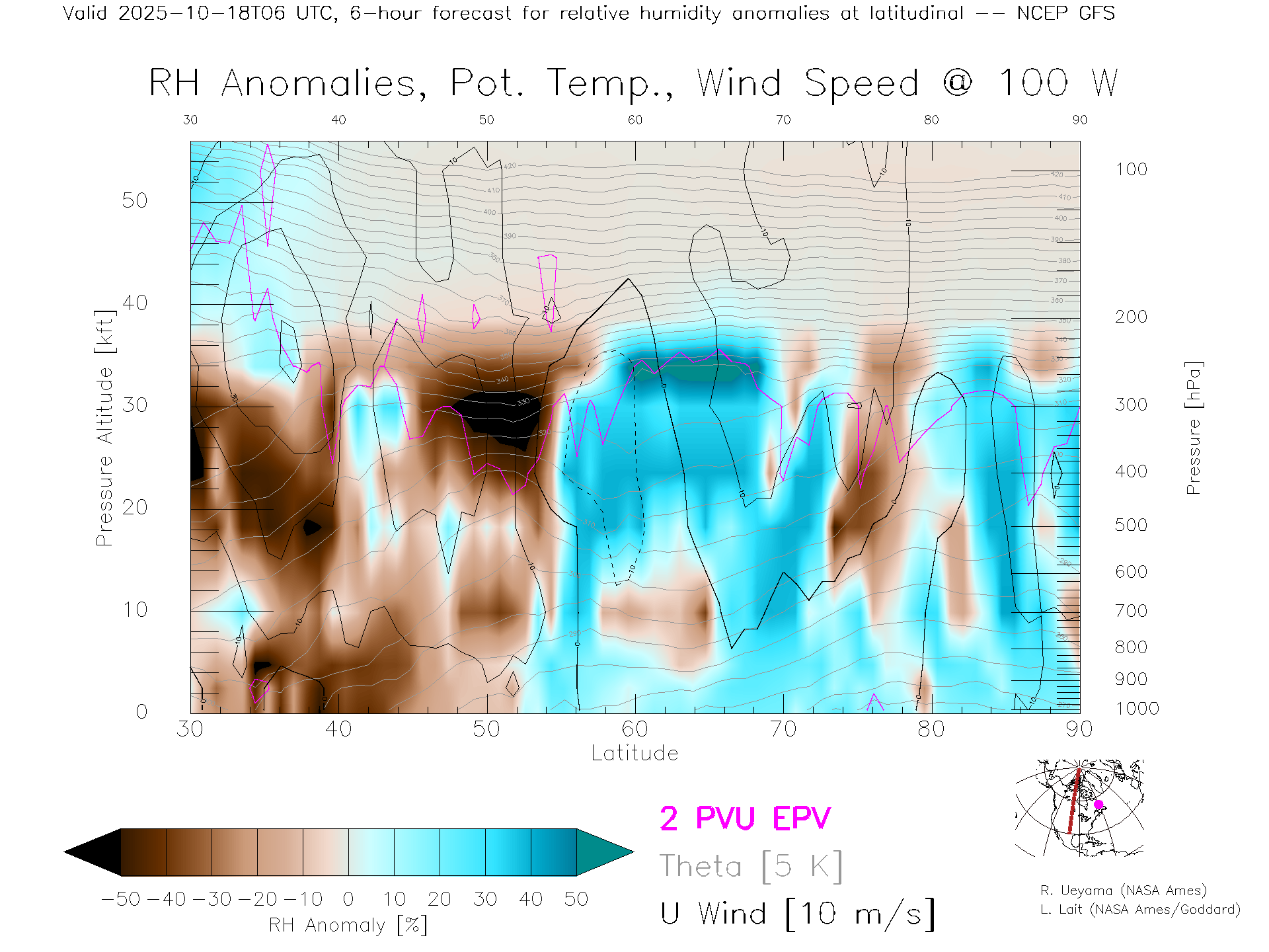 NCEP GFS Forecast Rel. Hum. X-Section (100 W)