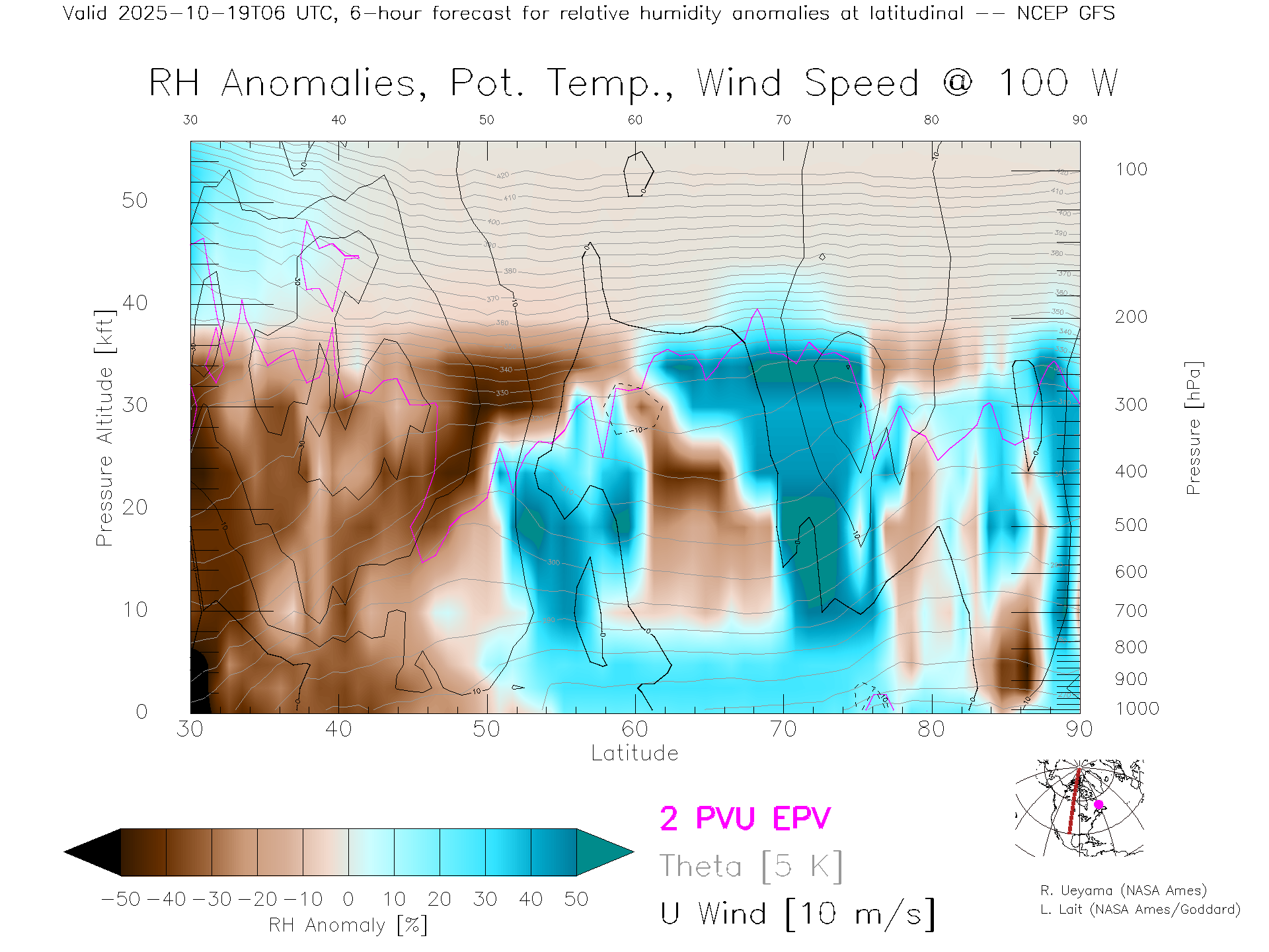 NCEP GFS Forecast Rel. Hum. X-Section (100 W)