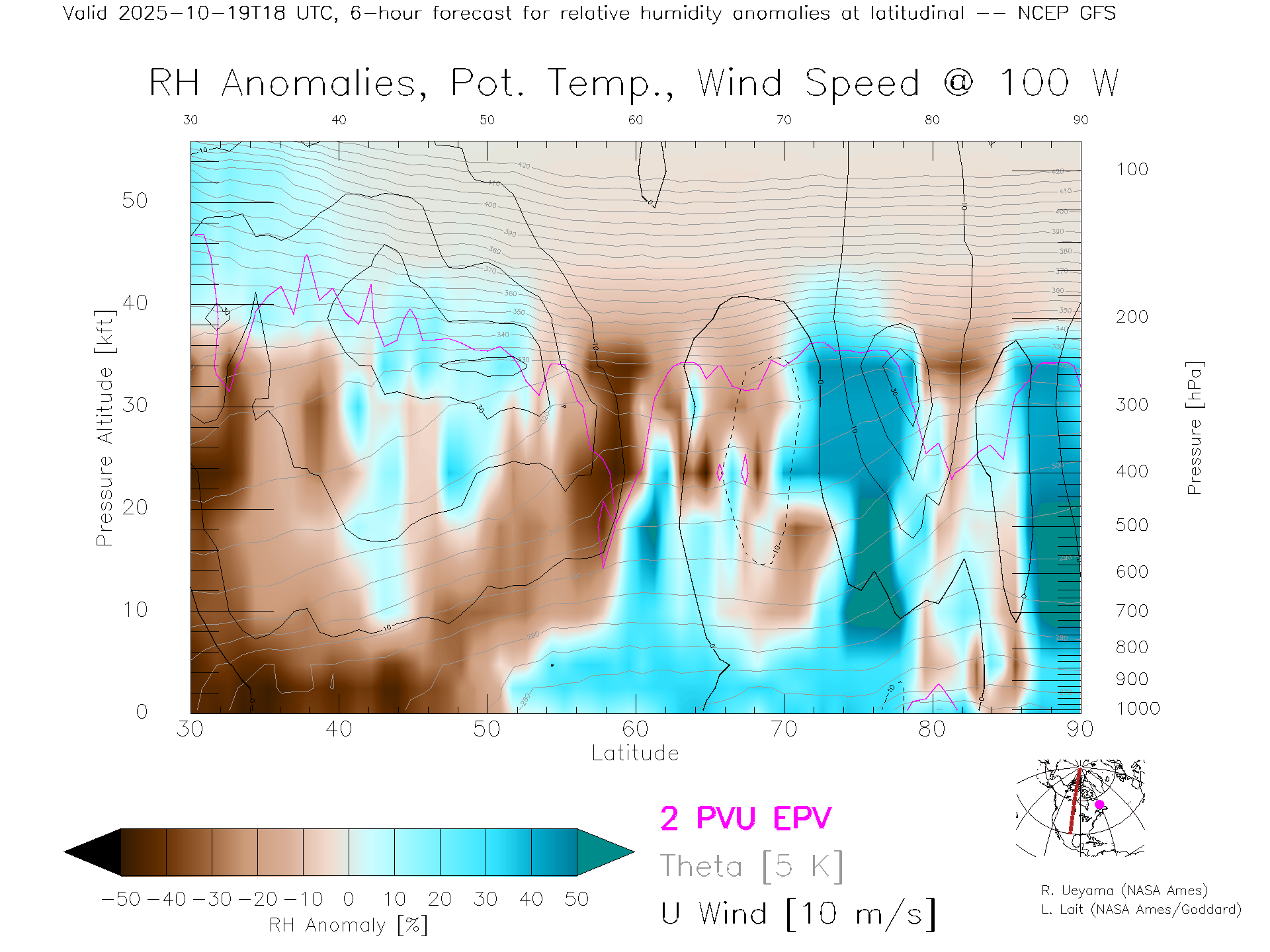 NCEP GFS Forecast Rel. Hum. X-Section (100 W)