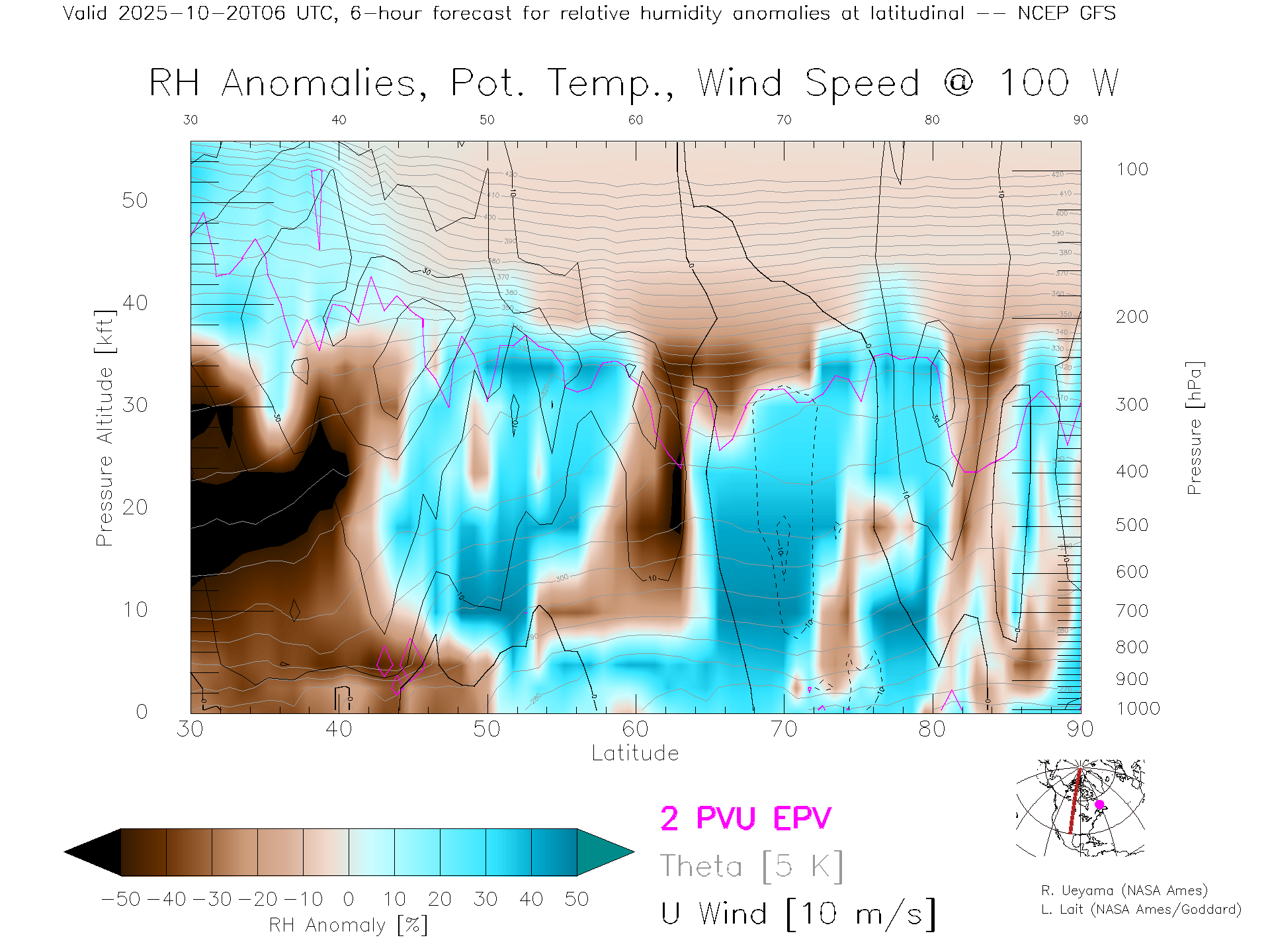 NCEP GFS Forecast Rel. Hum. X-Section (100 W)