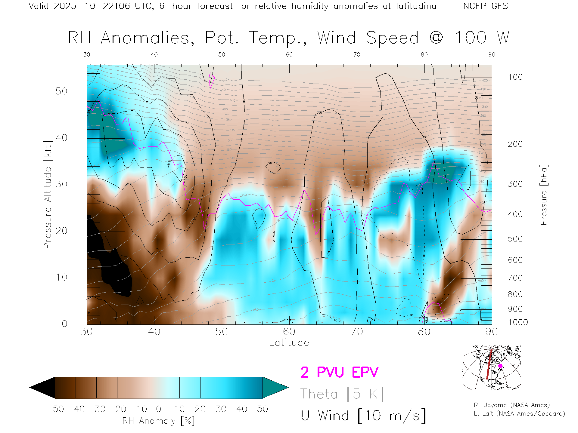 NCEP GFS Forecast Rel. Hum. X-Section (100 W)