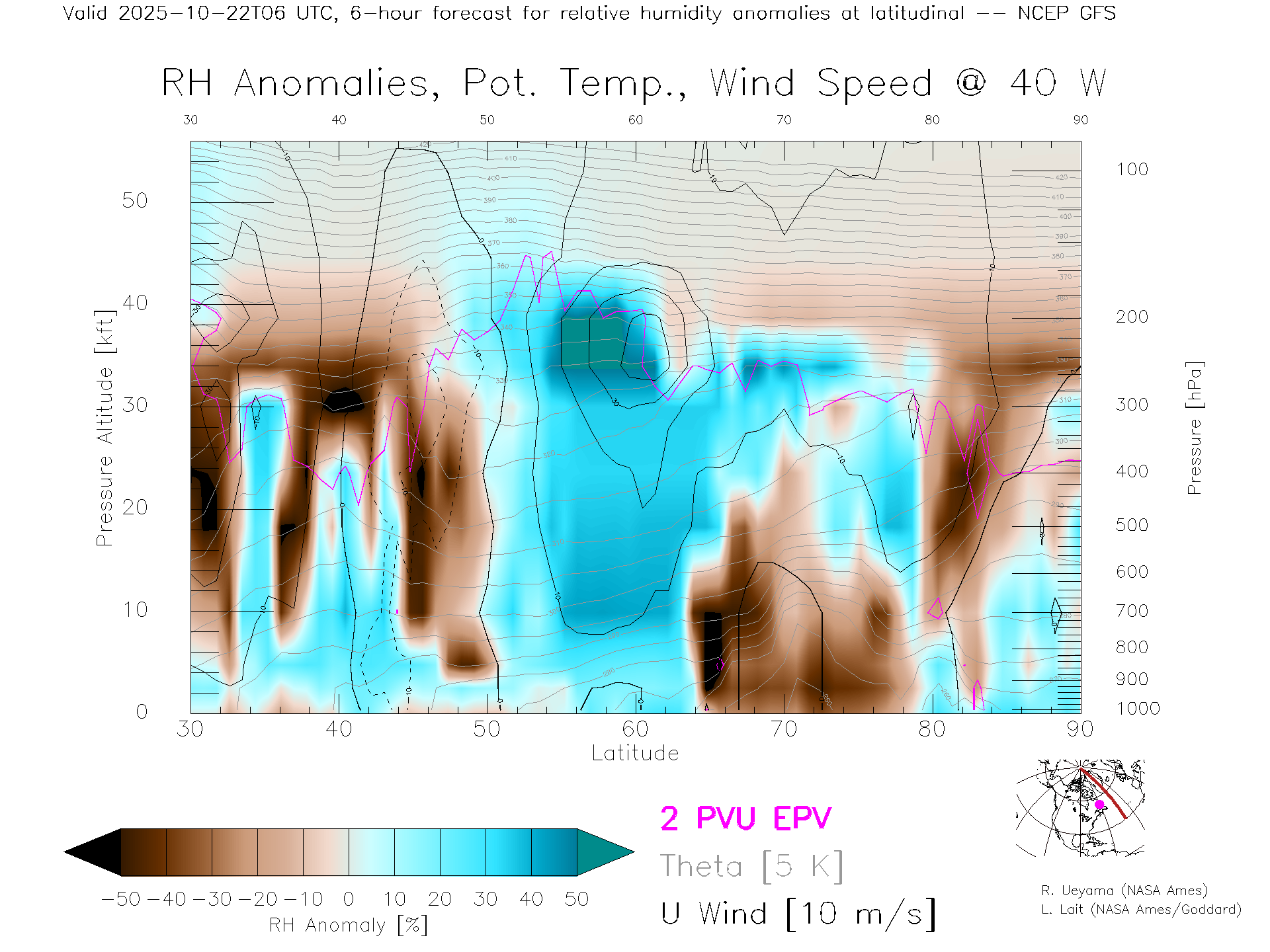 NCEP GFS Forecast Rel. Hum. X-Section (40 W)