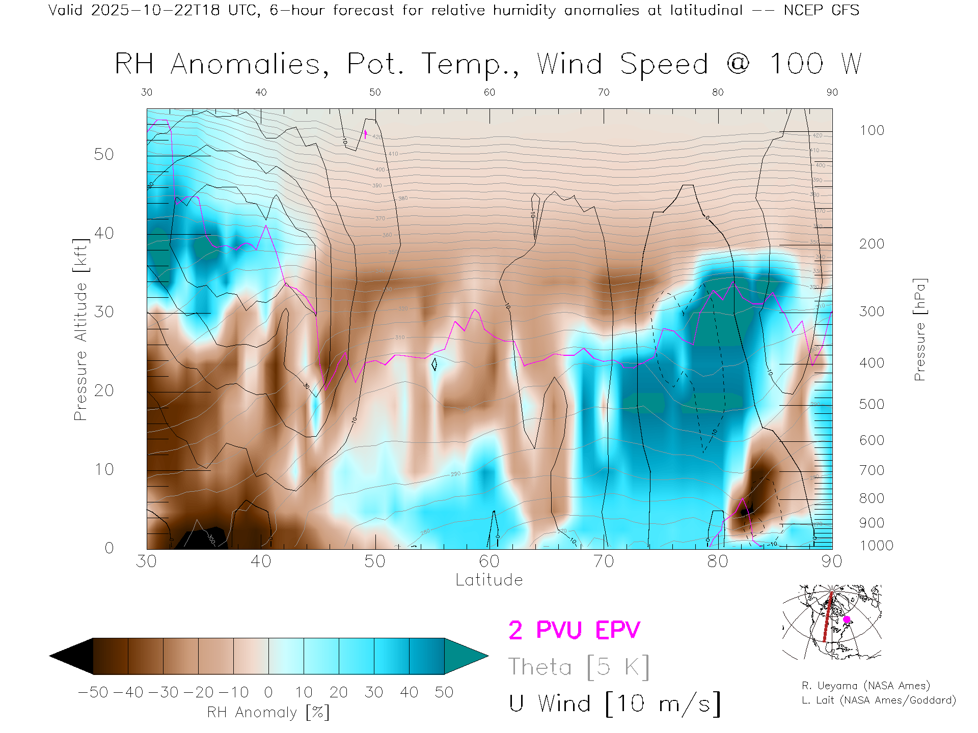 NCEP GFS Forecast Rel. Hum. X-Section (100 W)