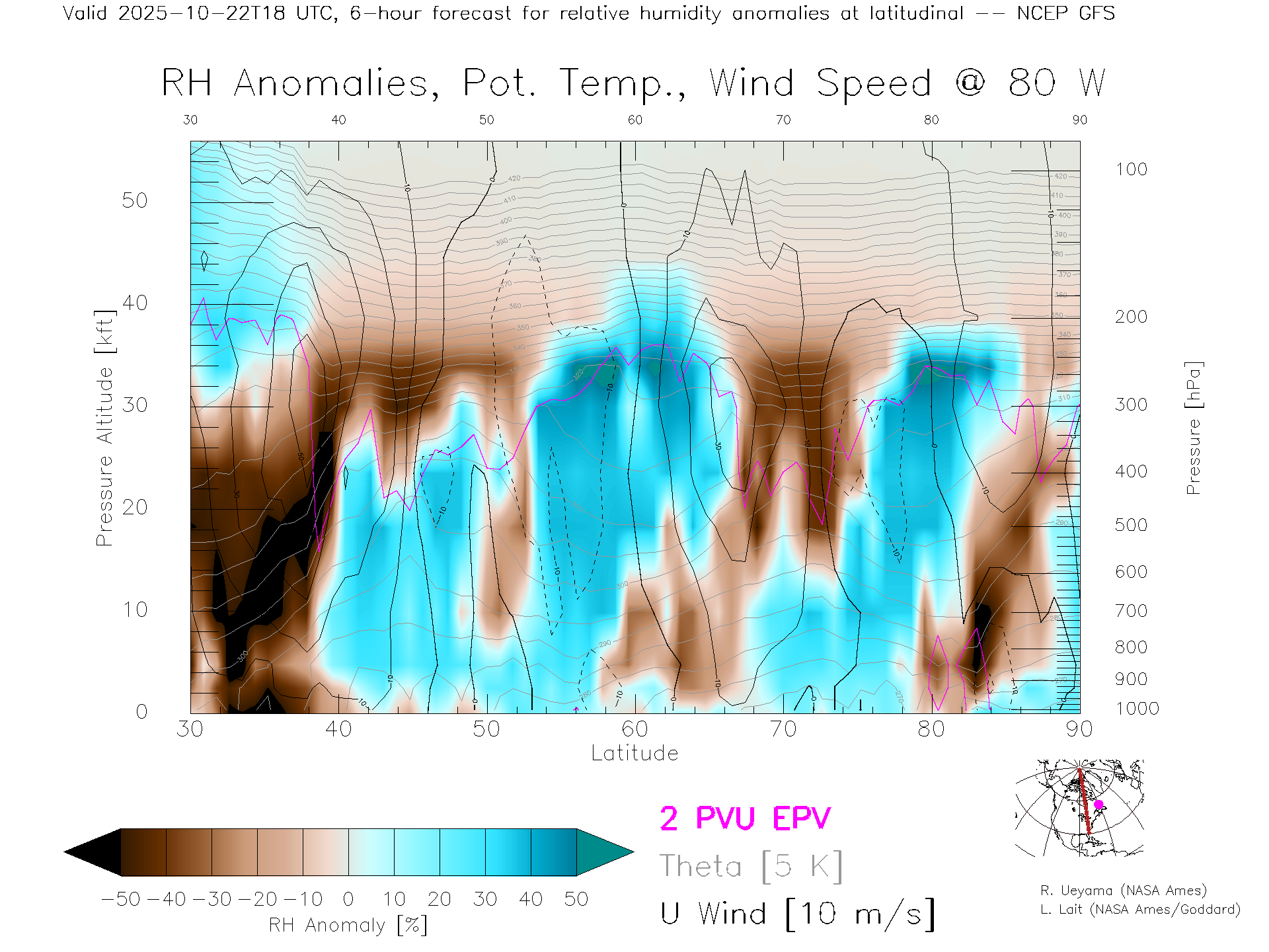 NCEP GFS Forecast Rel. Hum. X-Section (80 W)