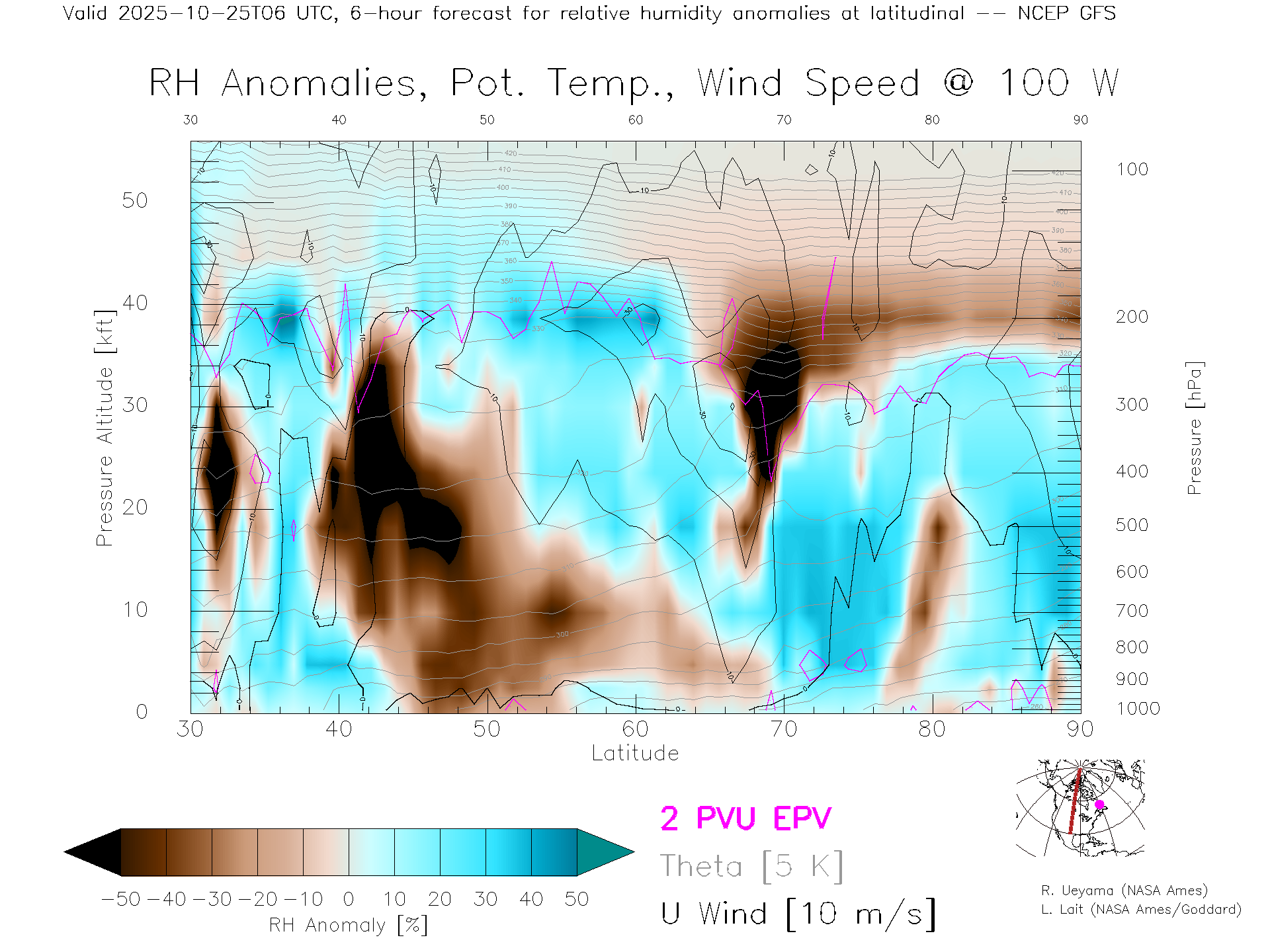 NCEP GFS Forecast Rel. Hum. X-Section (100 W)