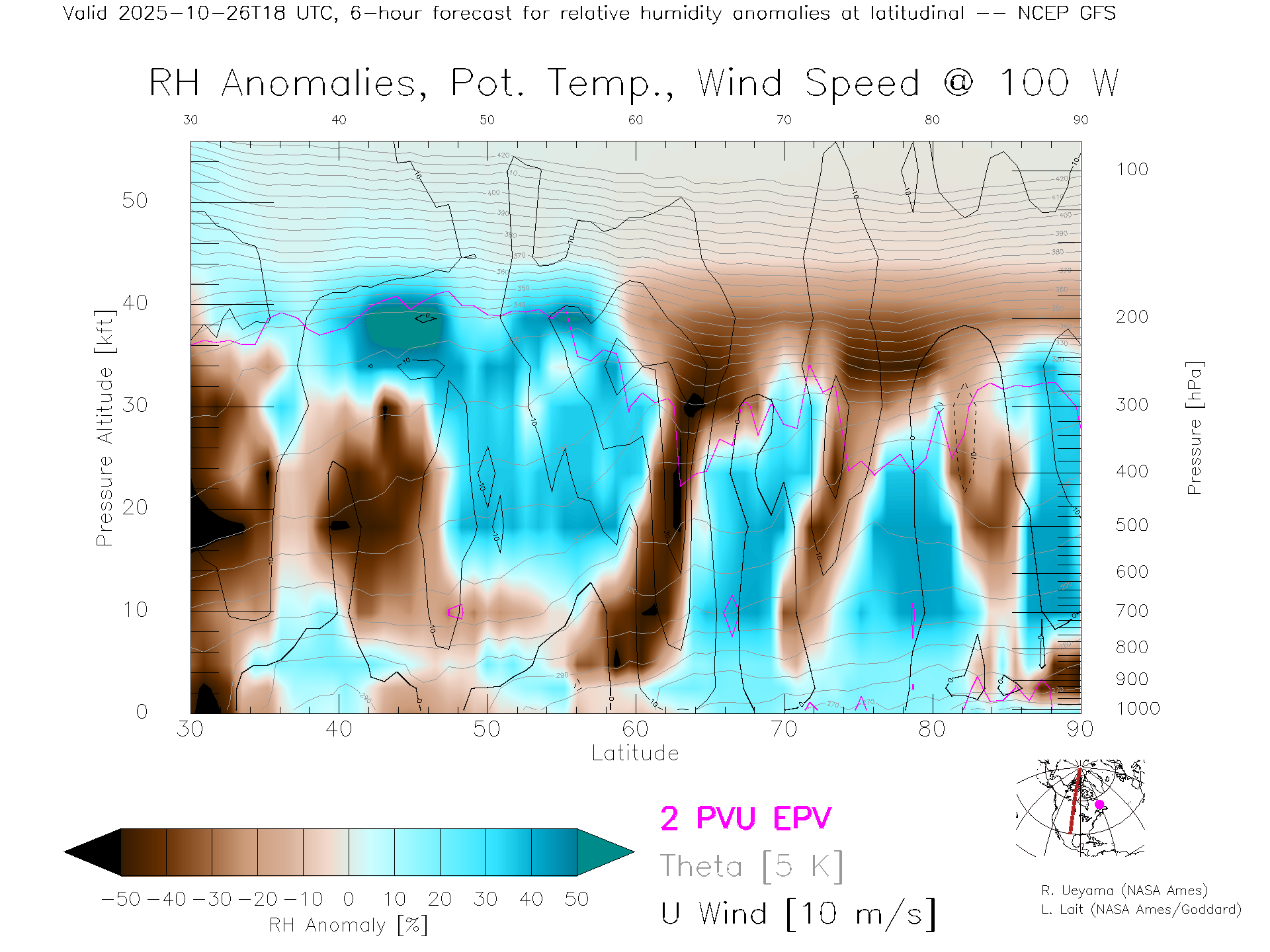 NCEP GFS Forecast Rel. Hum. X-Section (100 W)
