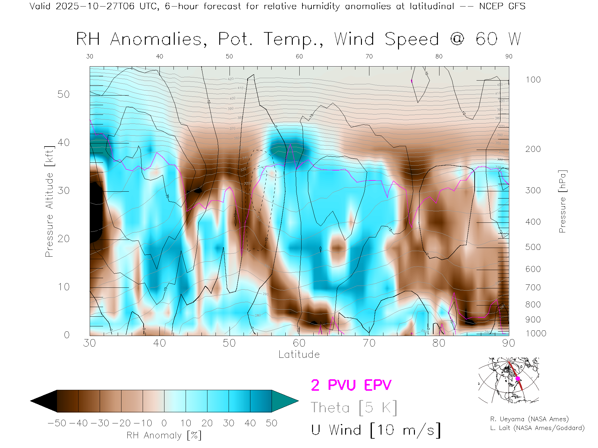 NCEP GFS Forecast Rel. Hum. X-Section (60 W)