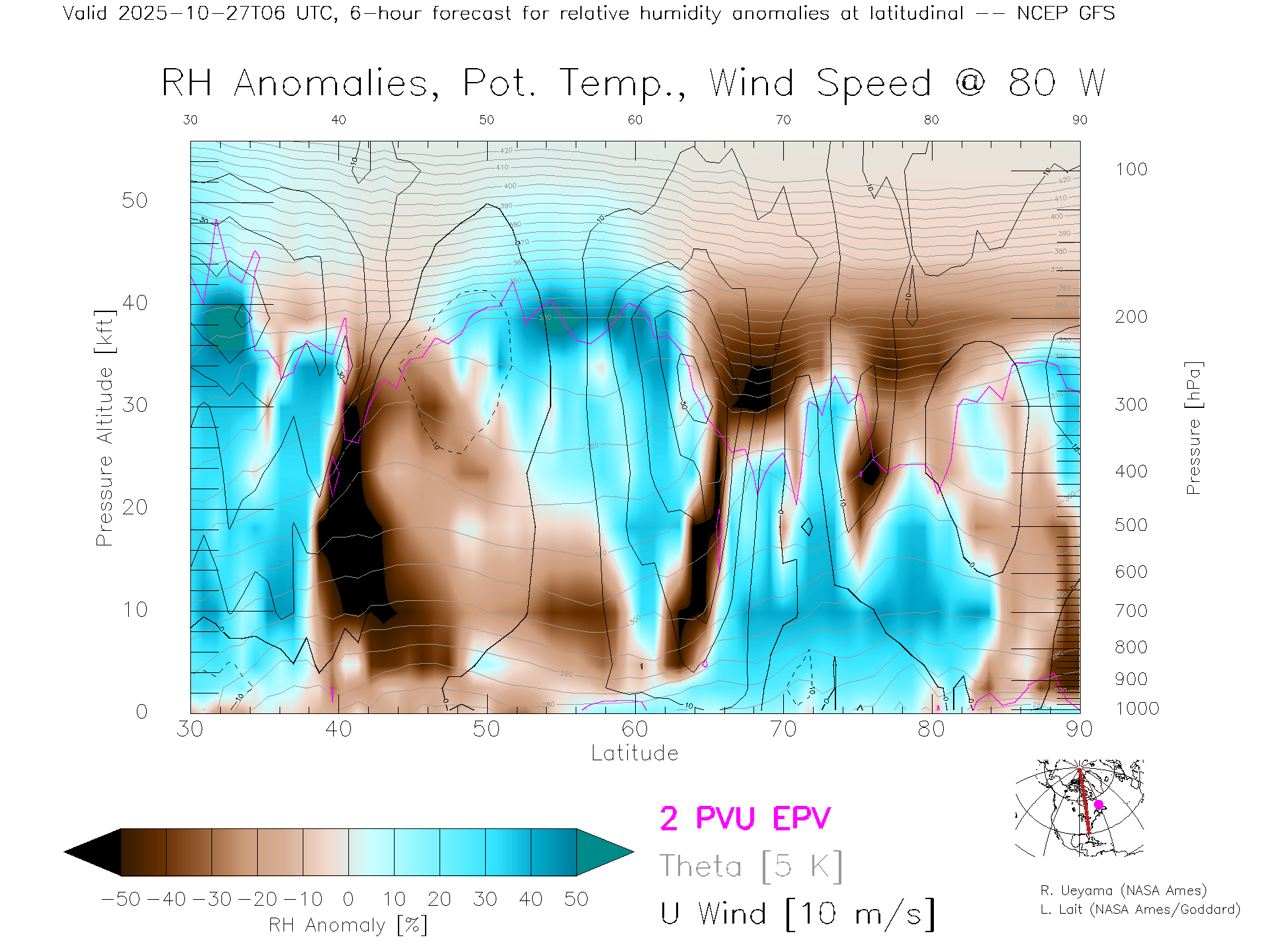 NCEP GFS Forecast Rel. Hum. X-Section (80 W)