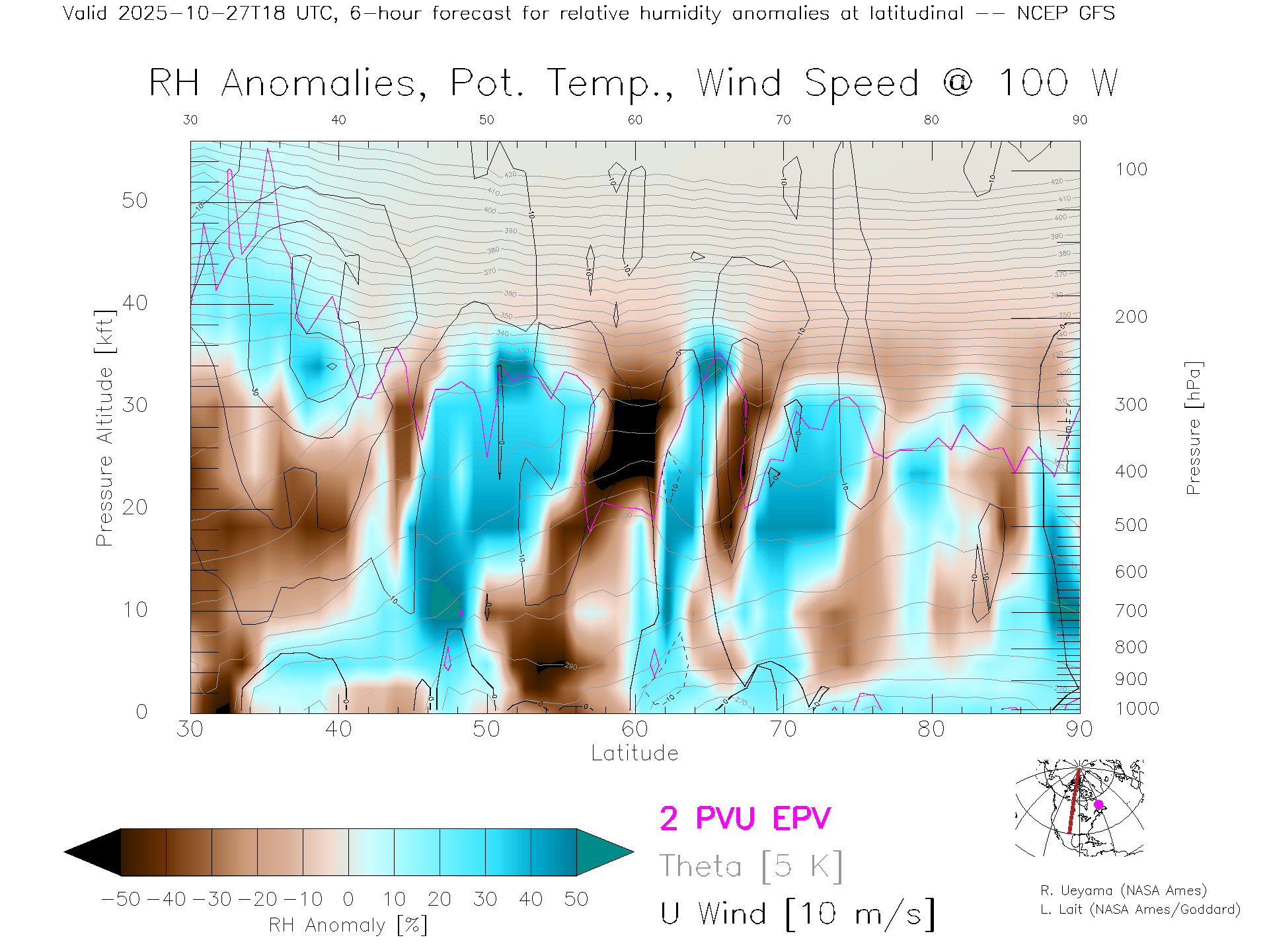 NCEP GFS Forecast Rel. Hum. X-Section (100 W)