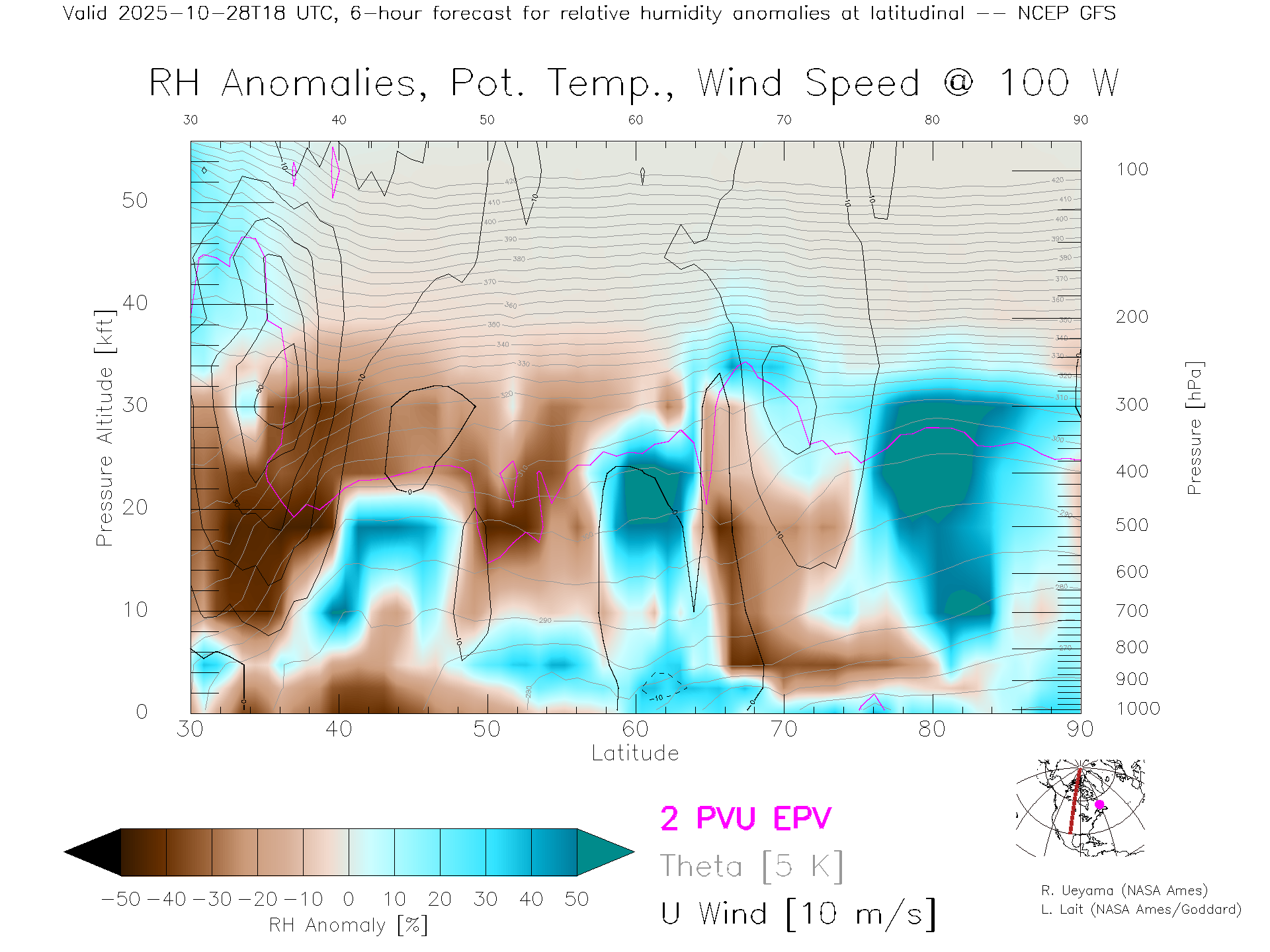 NCEP GFS Forecast Rel. Hum. X-Section (100 W)