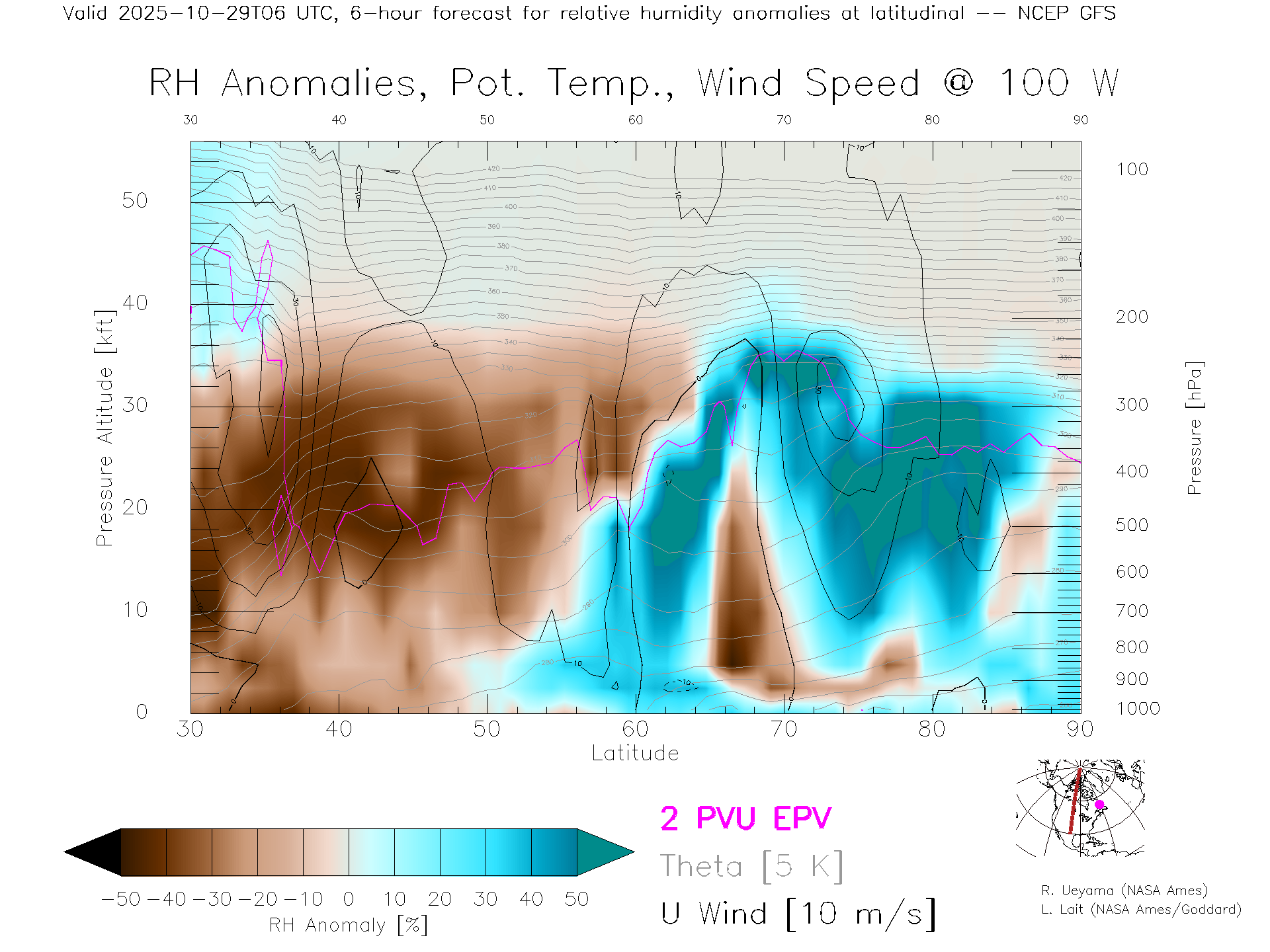 NCEP GFS Forecast Rel. Hum. X-Section (100 W)