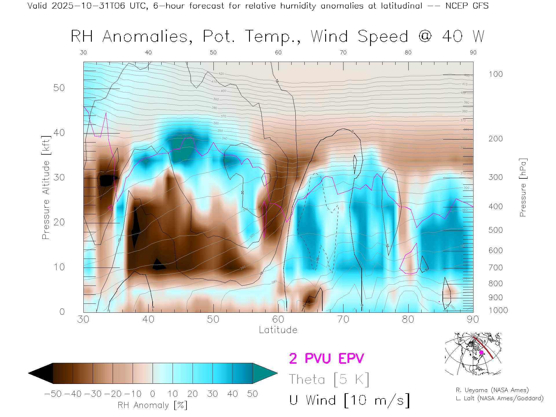 NCEP GFS Forecast Rel. Hum. X-Section (40 W)
