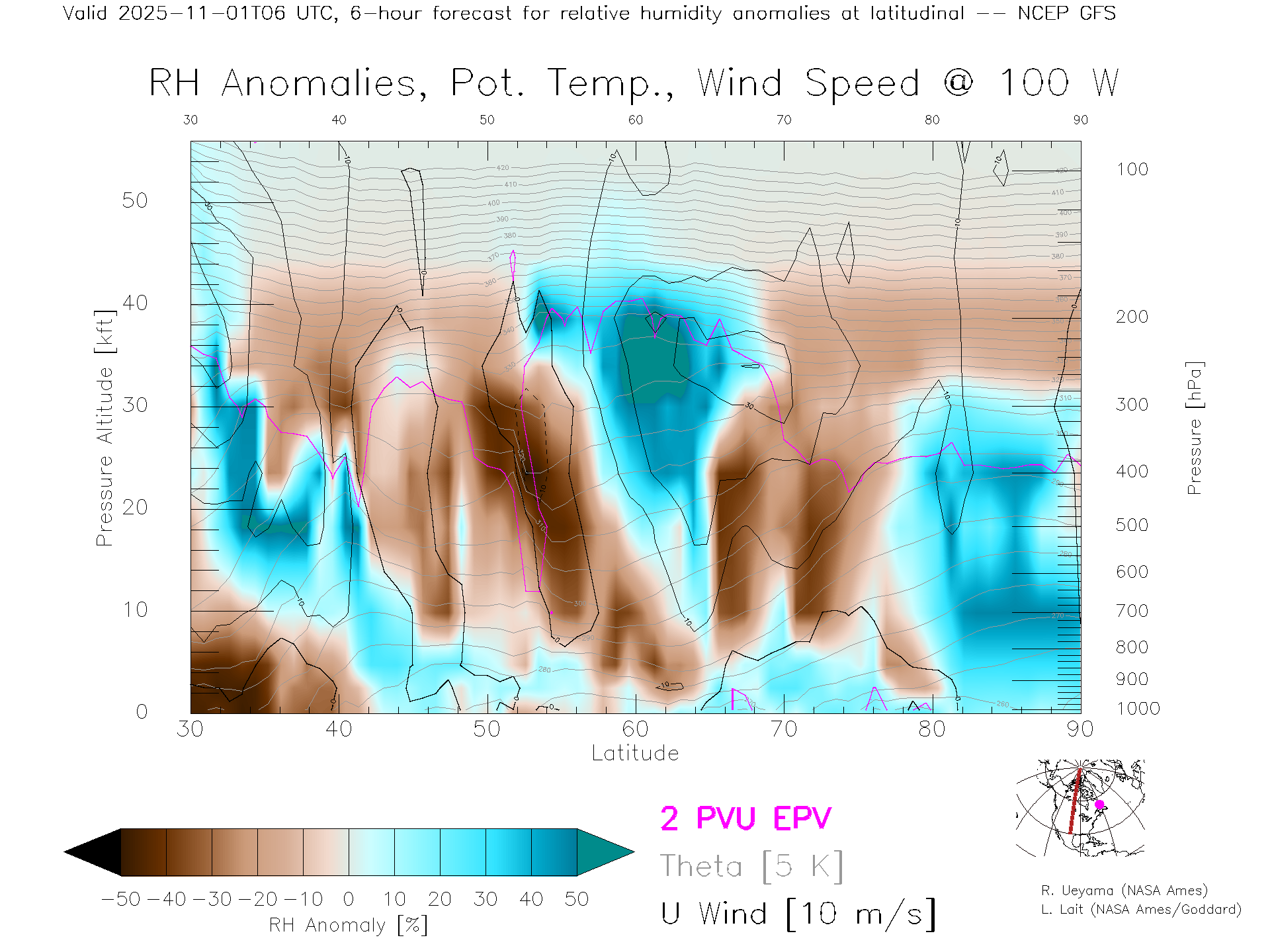 NCEP GFS Forecast Rel. Hum. X-Section (100 W)