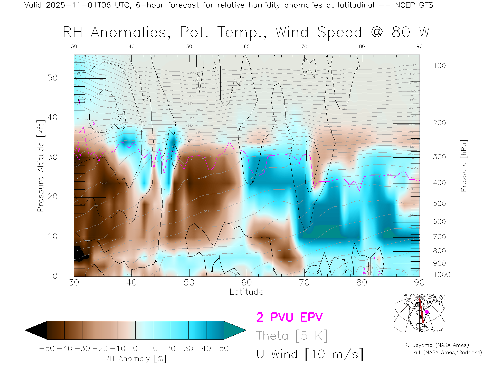 NCEP GFS Forecast Rel. Hum. X-Section (80 W)