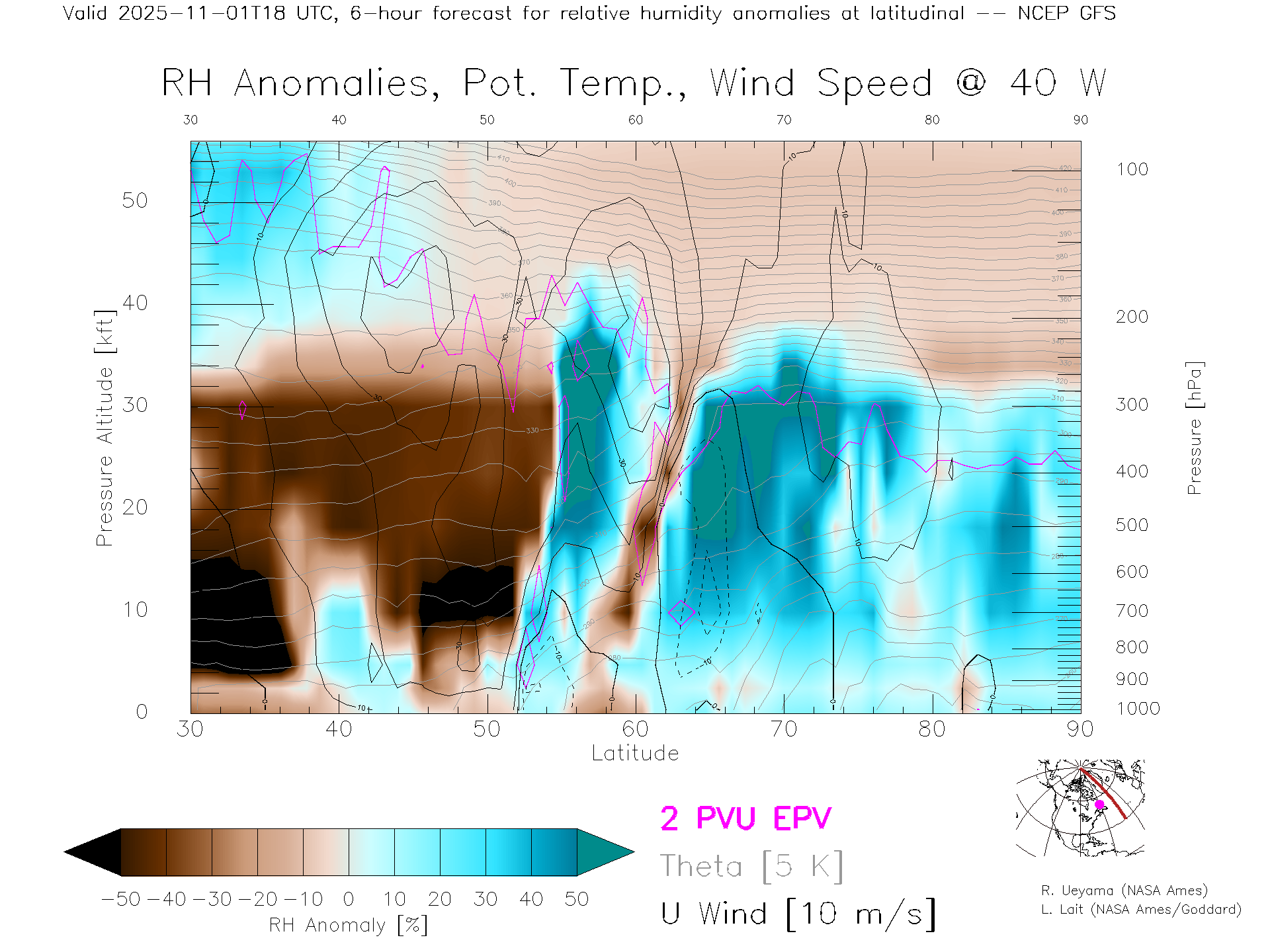 NCEP GFS Forecast Rel. Hum. X-Section (40 W)