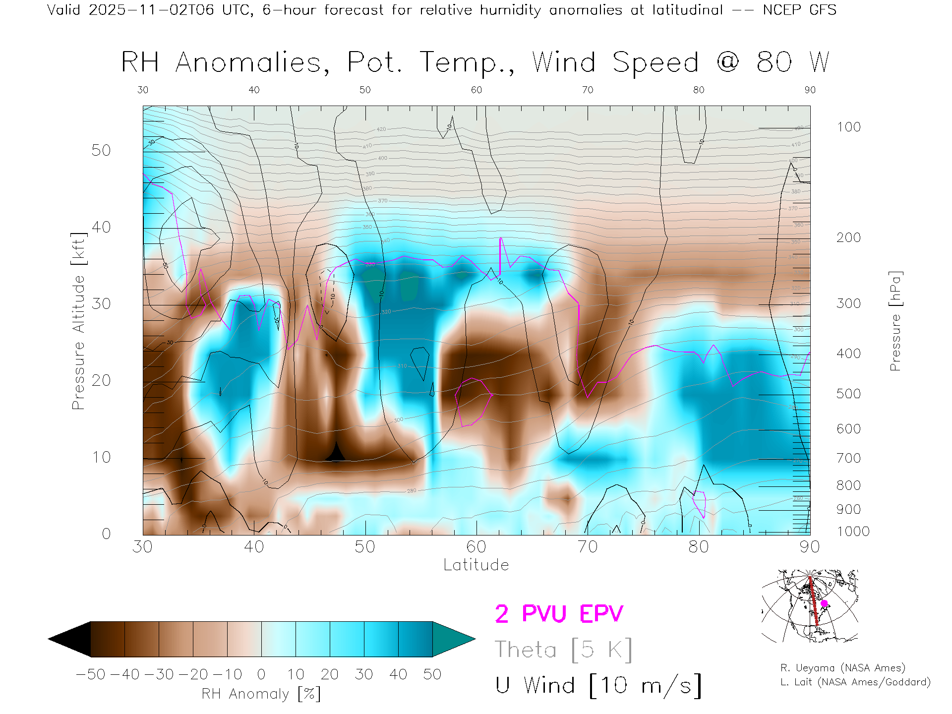 NCEP GFS Forecast Rel. Hum. X-Section (80 W)