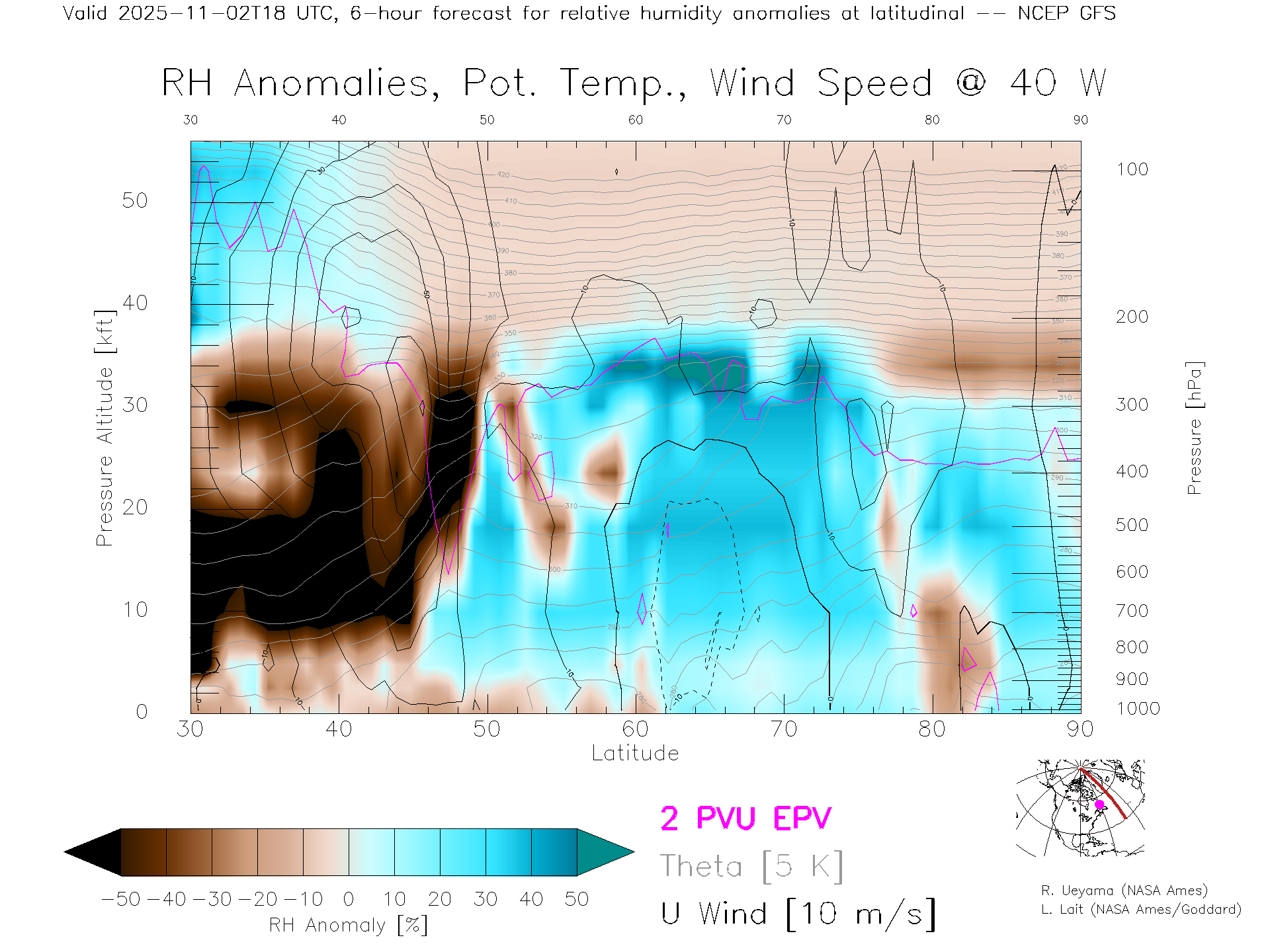 NCEP GFS Forecast Rel. Hum. X-Section (40 W)