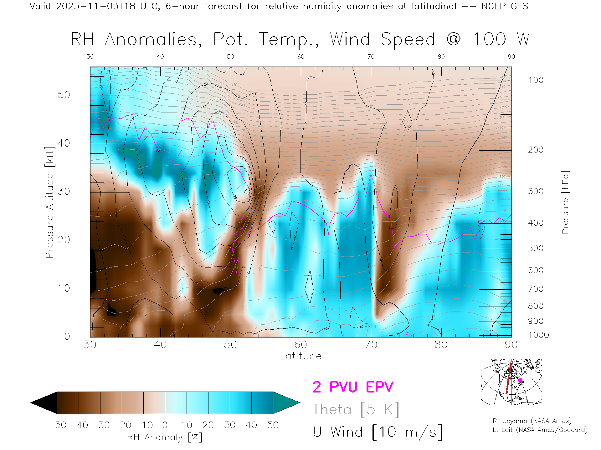 NCEP GFS Forecast Rel. Hum. X-Section (100 W)
