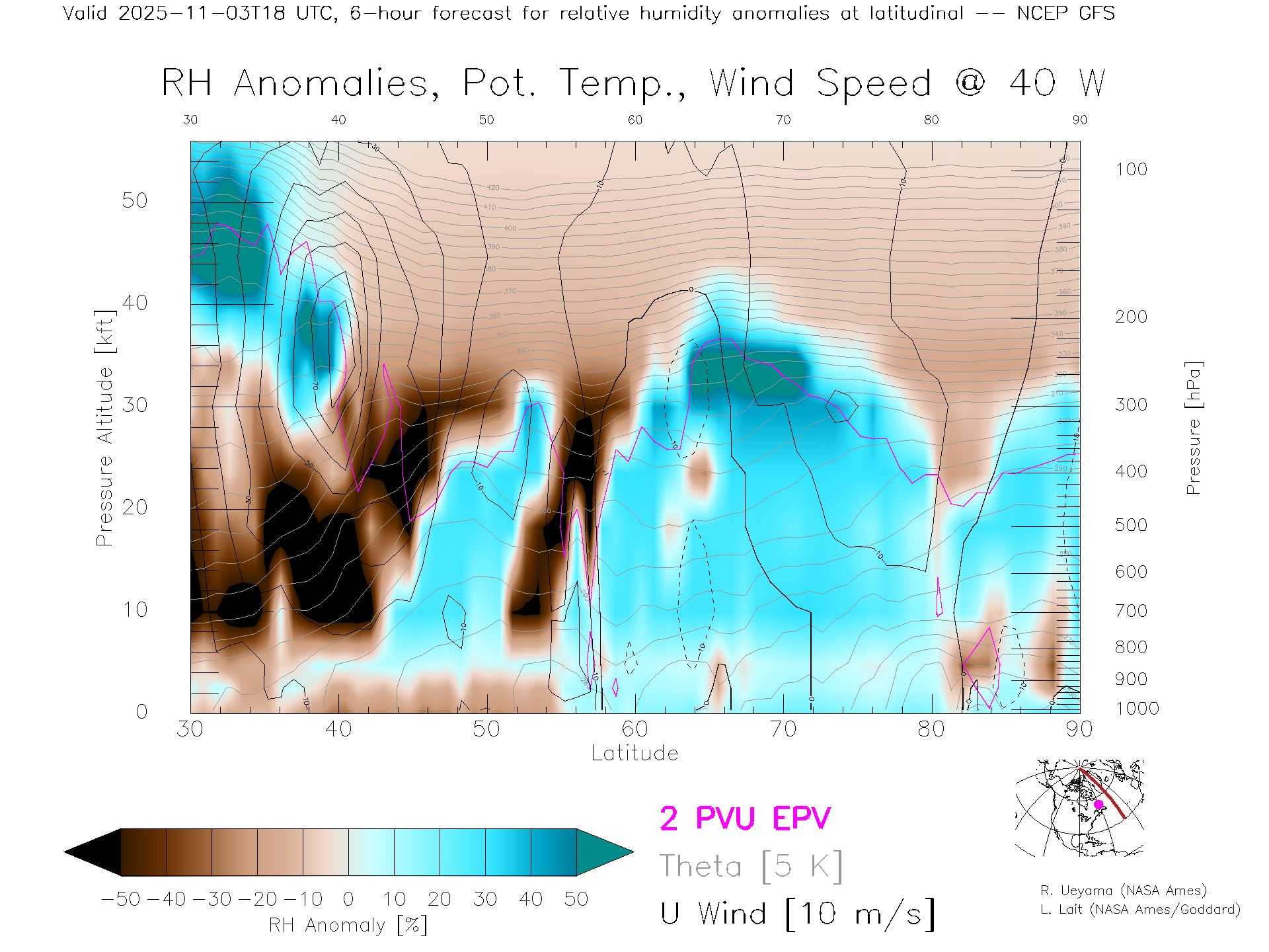 NCEP GFS Forecast Rel. Hum. X-Section (40 W)