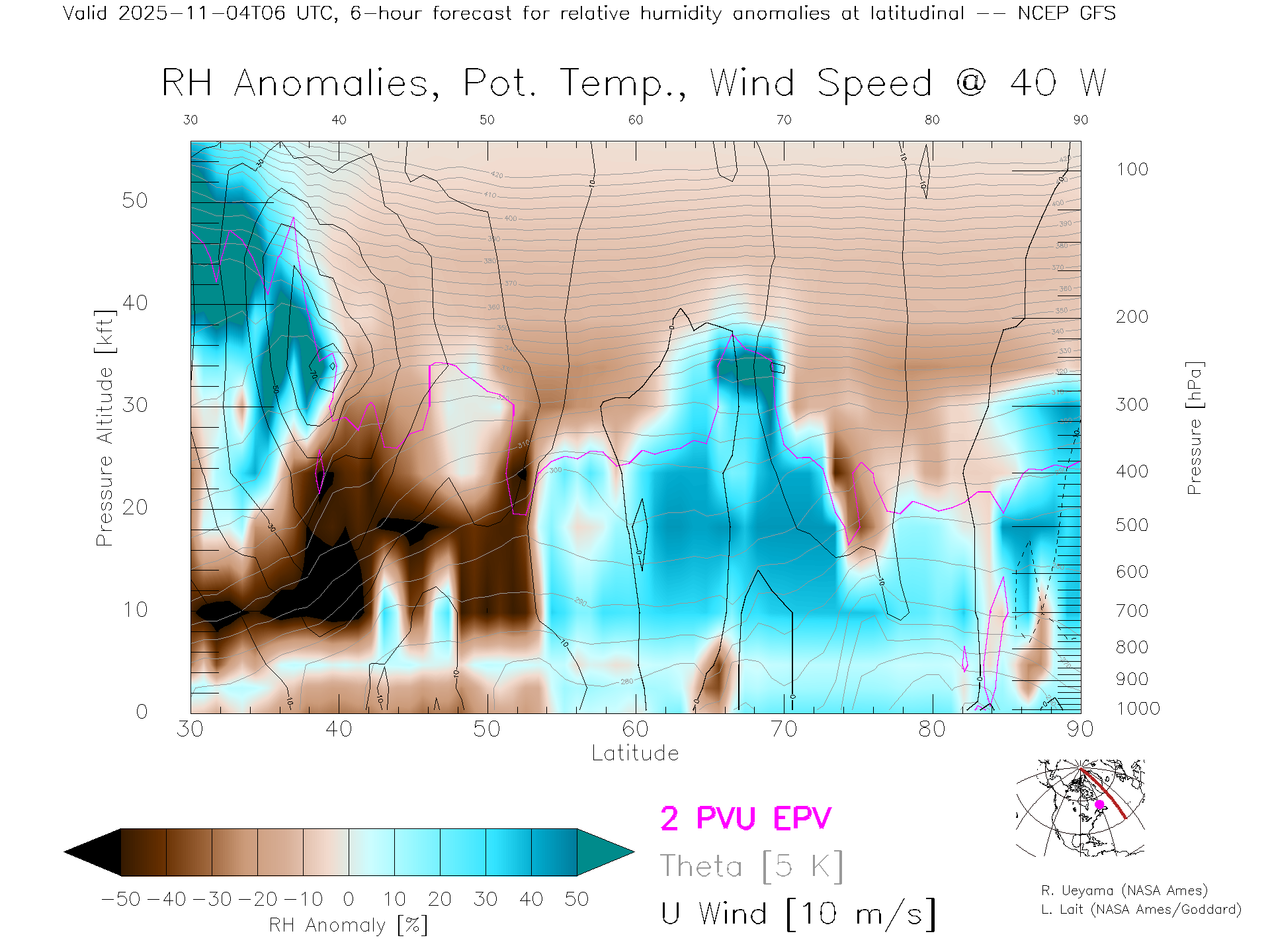 NCEP GFS Forecast Rel. Hum. X-Section (40 W)