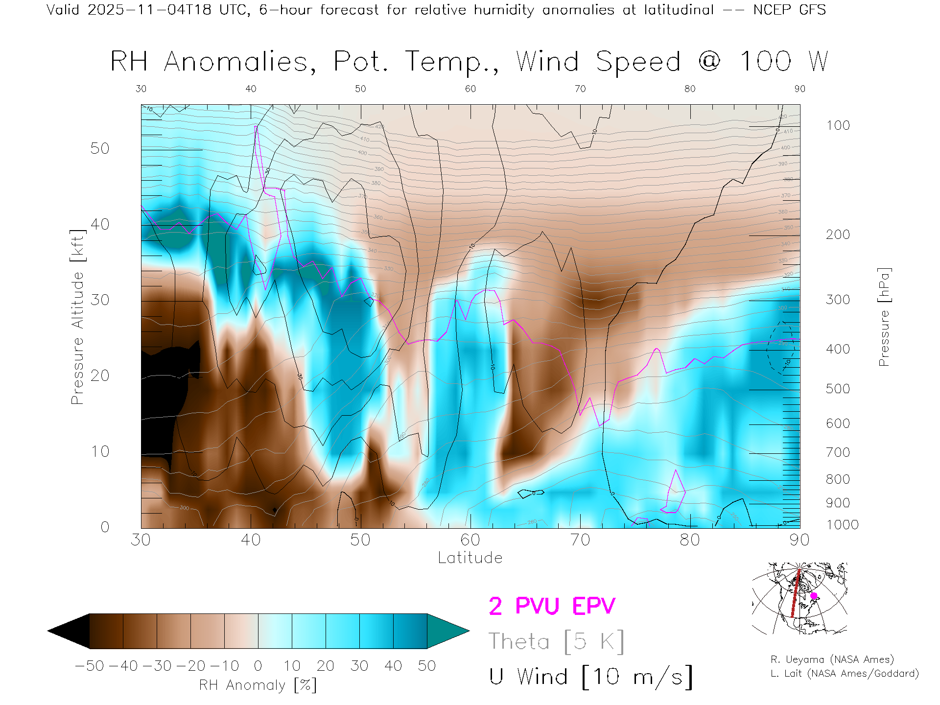 NCEP GFS Forecast Rel. Hum. X-Section (100 W)
