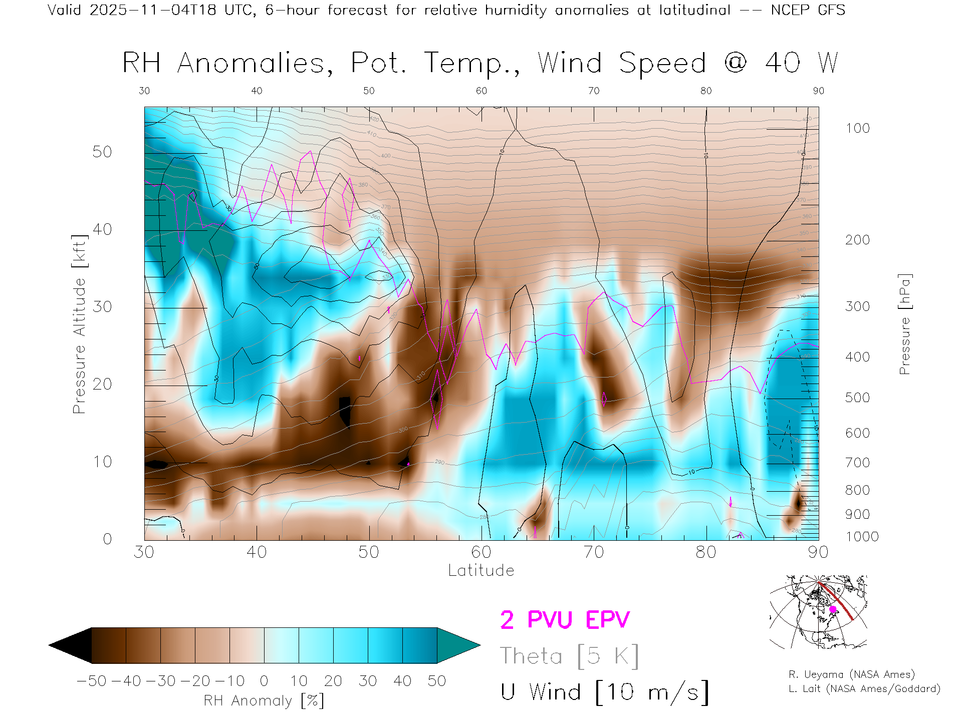 NCEP GFS Forecast Rel. Hum. X-Section (40 W)