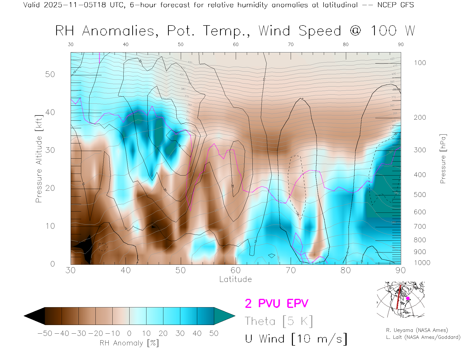 NCEP GFS Forecast Rel. Hum. X-Section (100 W)