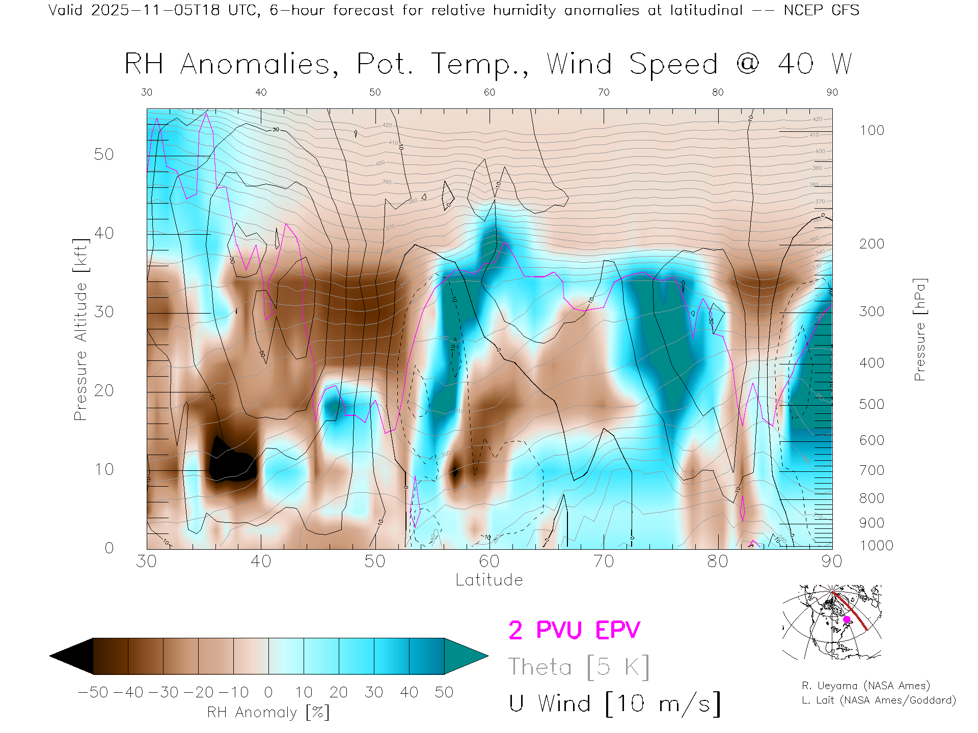 NCEP GFS Forecast Rel. Hum. X-Section (40 W)