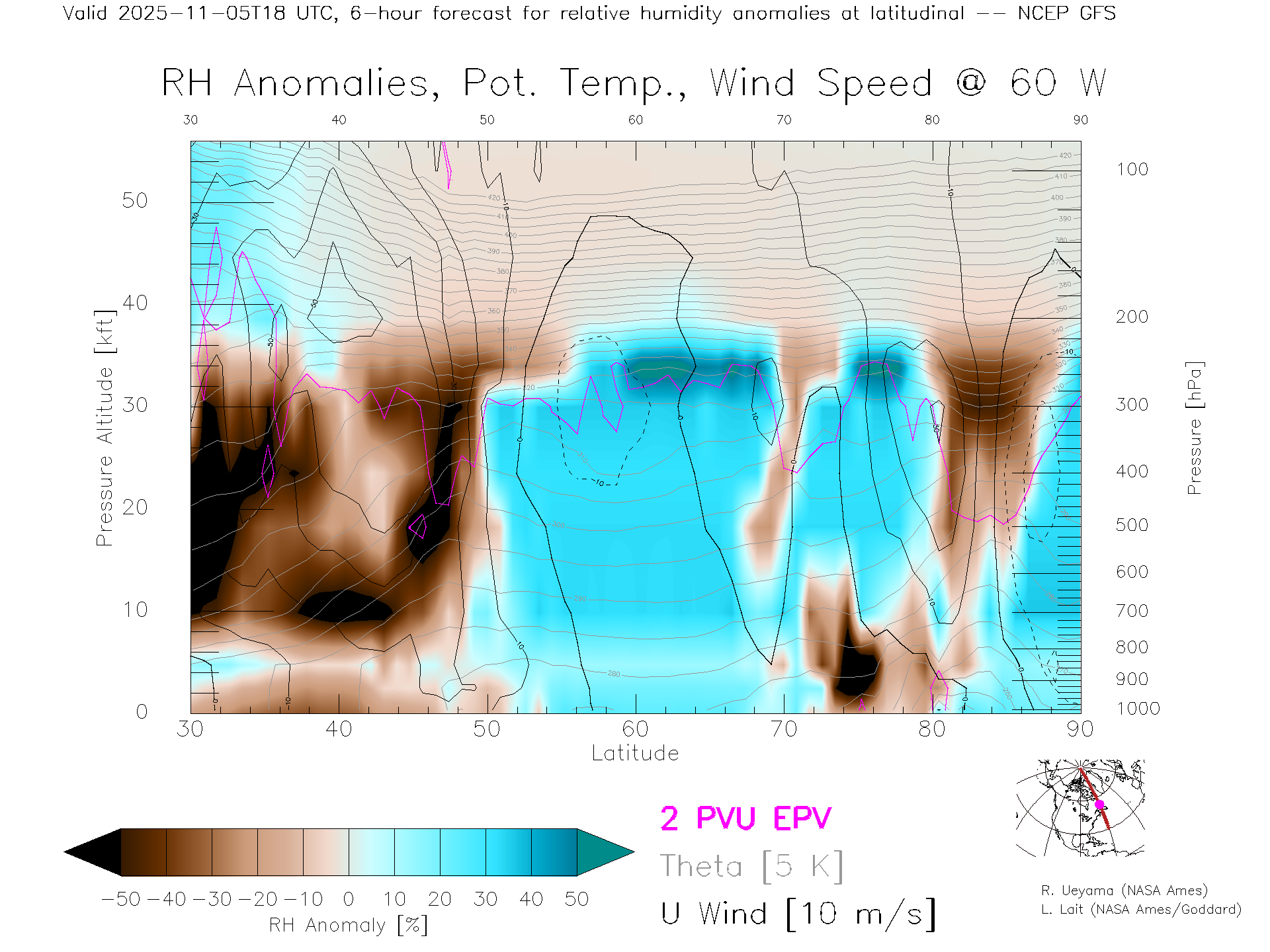 NCEP GFS Forecast Rel. Hum. X-Section (60 W)