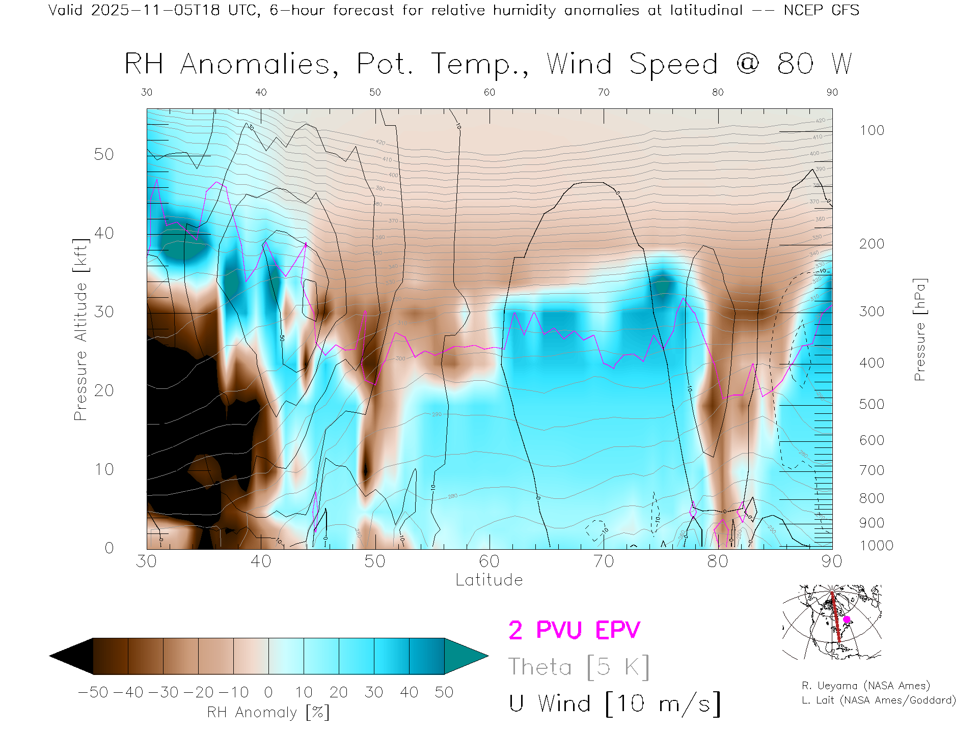 NCEP GFS Forecast Rel. Hum. X-Section (80 W)