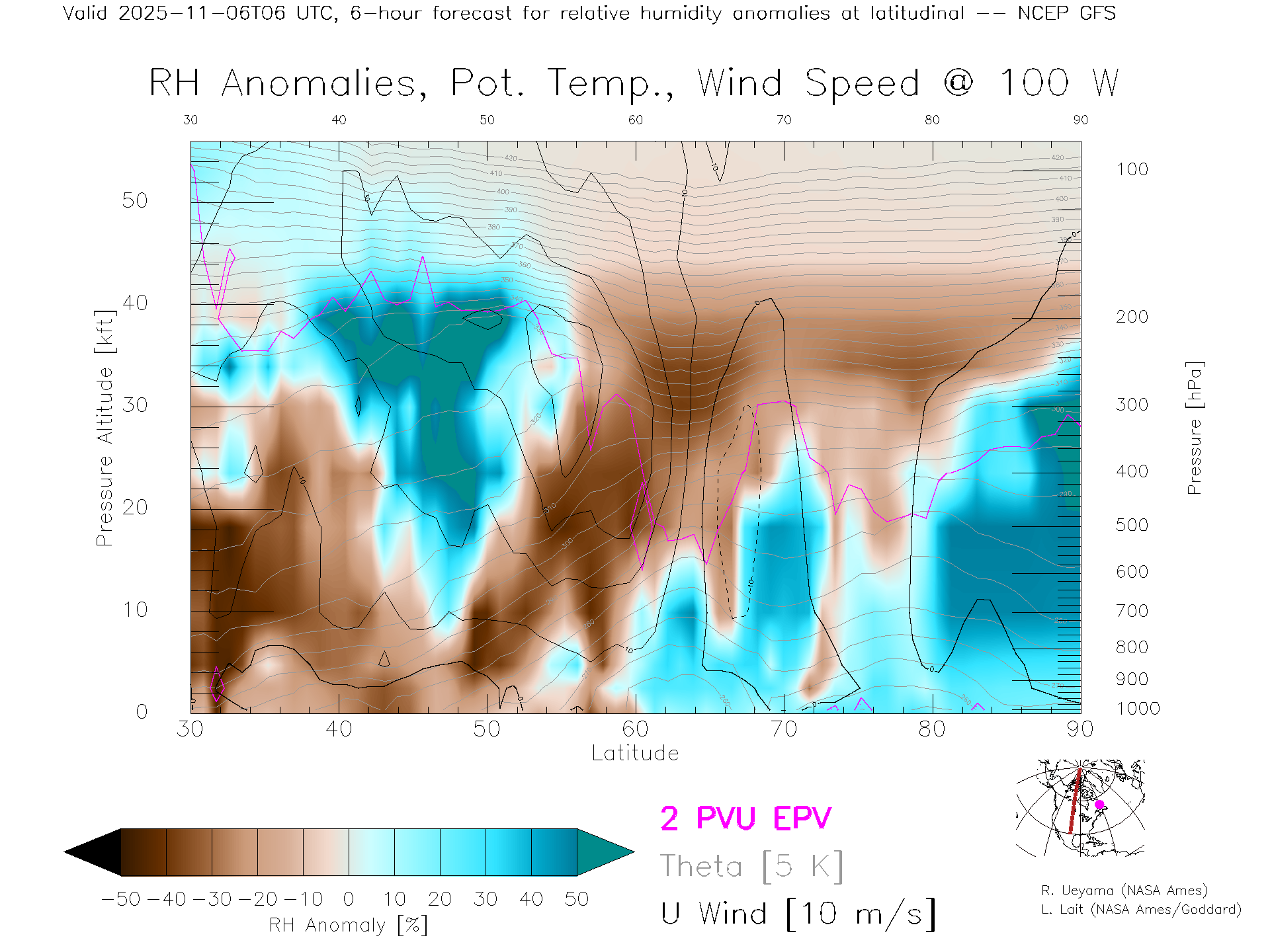 NCEP GFS Forecast Rel. Hum. X-Section (100 W)
