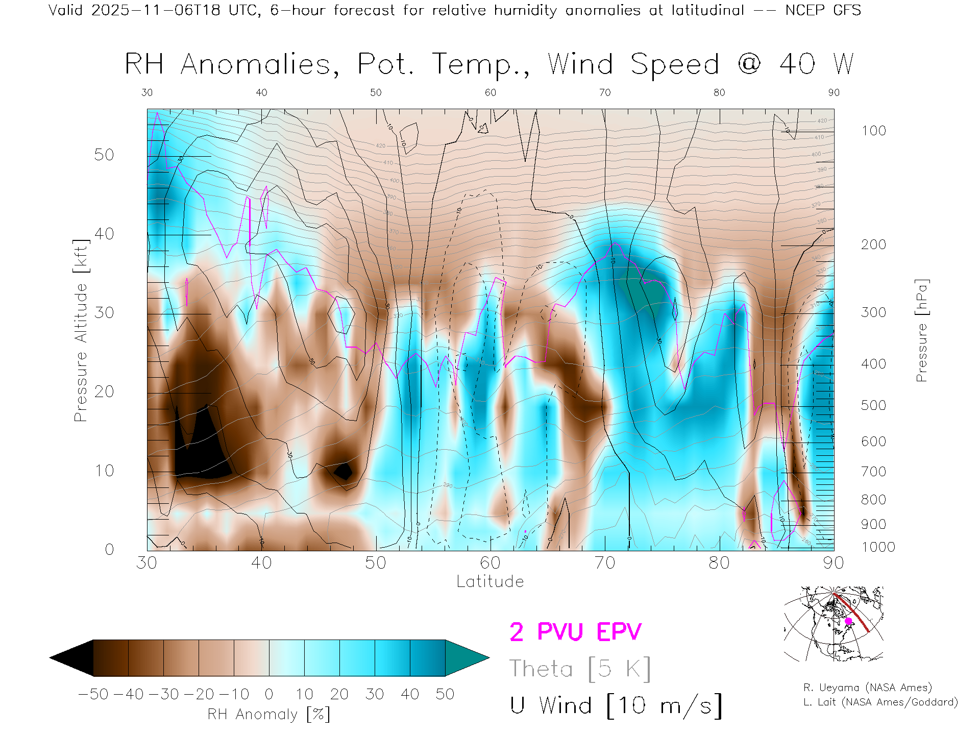 NCEP GFS Forecast Rel. Hum. X-Section (40 W)