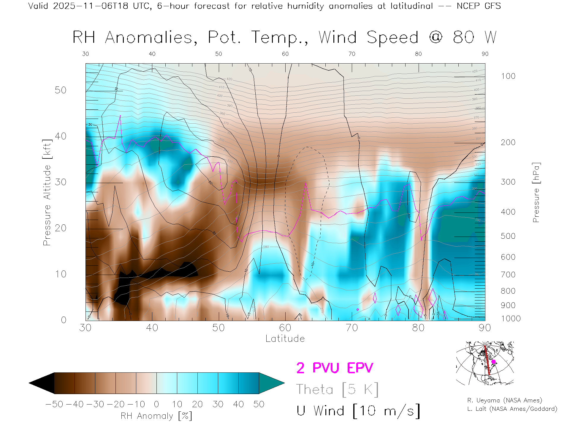NCEP GFS Forecast Rel. Hum. X-Section (80 W)