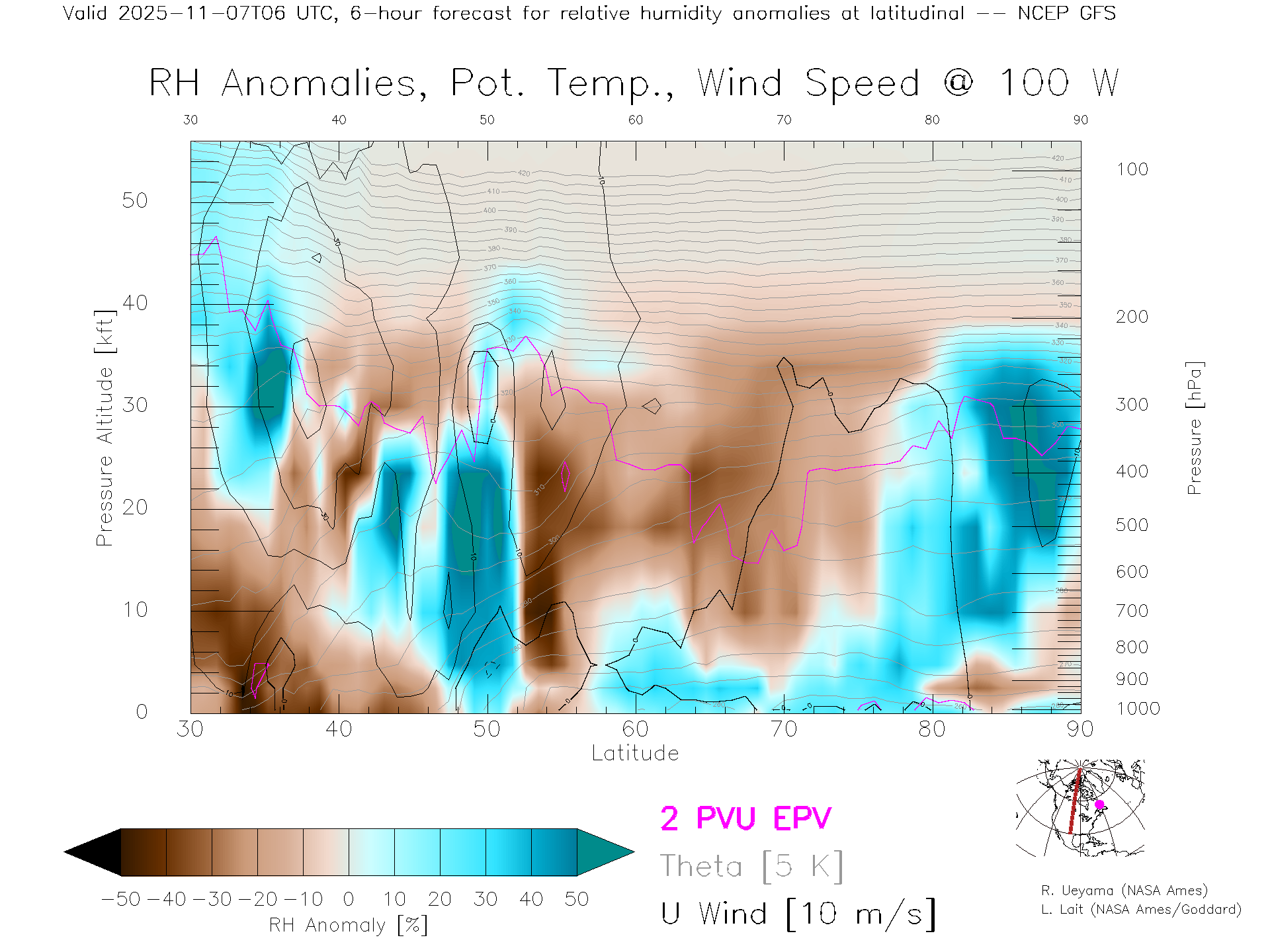 NCEP GFS Forecast Rel. Hum. X-Section (100 W)
