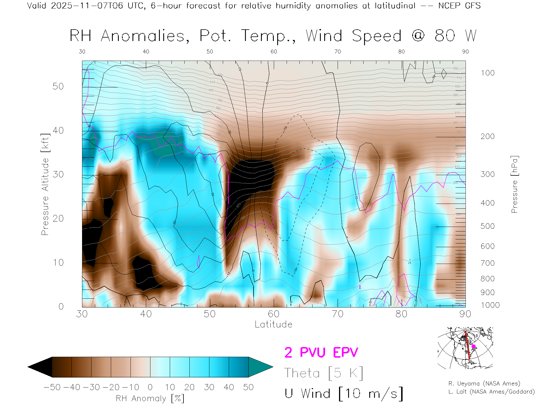 NCEP GFS Forecast Rel. Hum. X-Section (80 W)