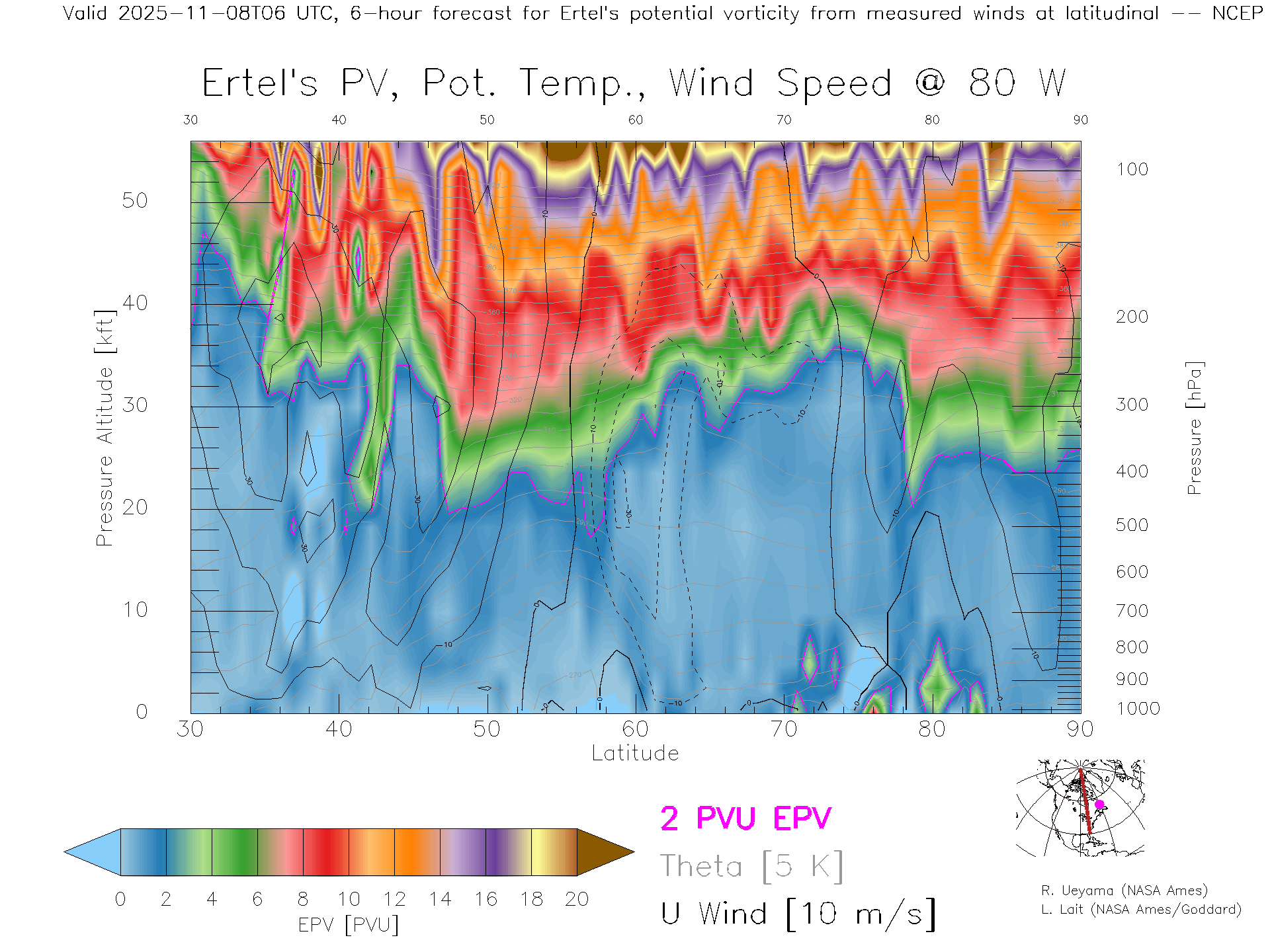 NCEP GFS Forecast PV X-Section (80 W)