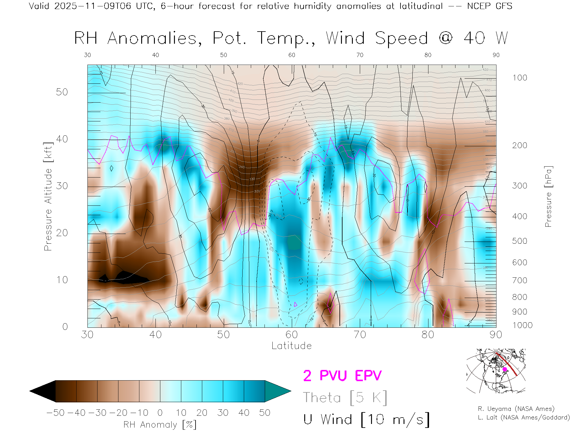NCEP GFS Forecast Rel. Hum. X-Section (40 W)
