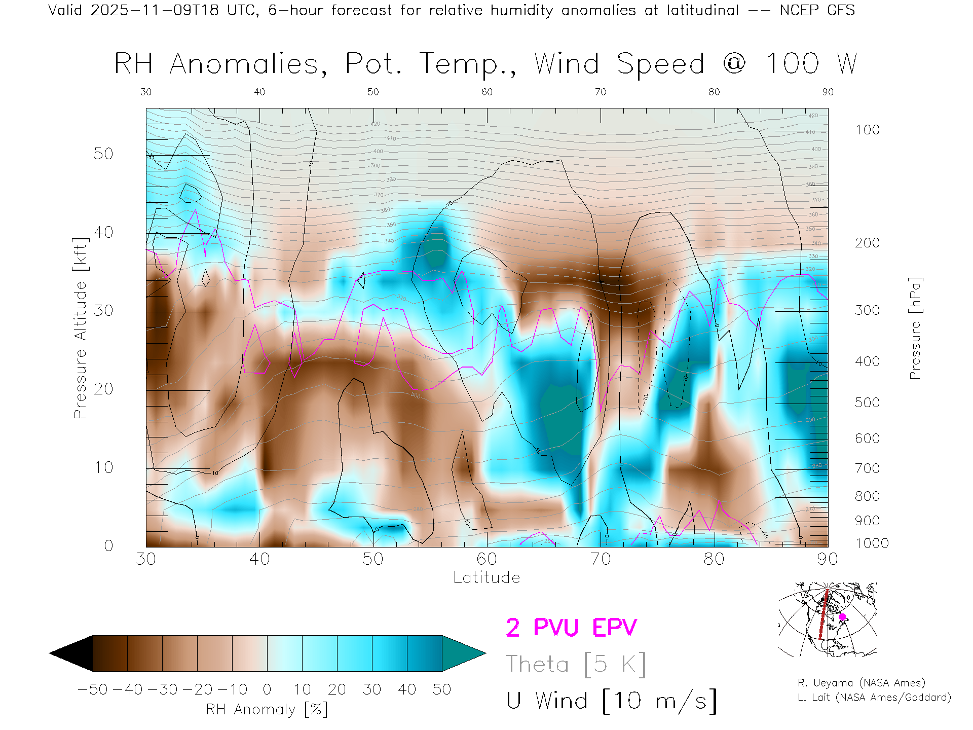 NCEP GFS Forecast Rel. Hum. X-Section (100 W)