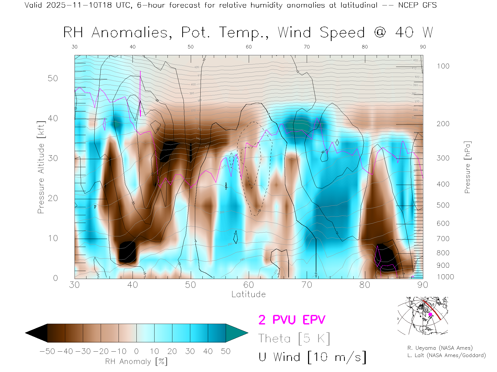 NCEP GFS Forecast Rel. Hum. X-Section (40 W)