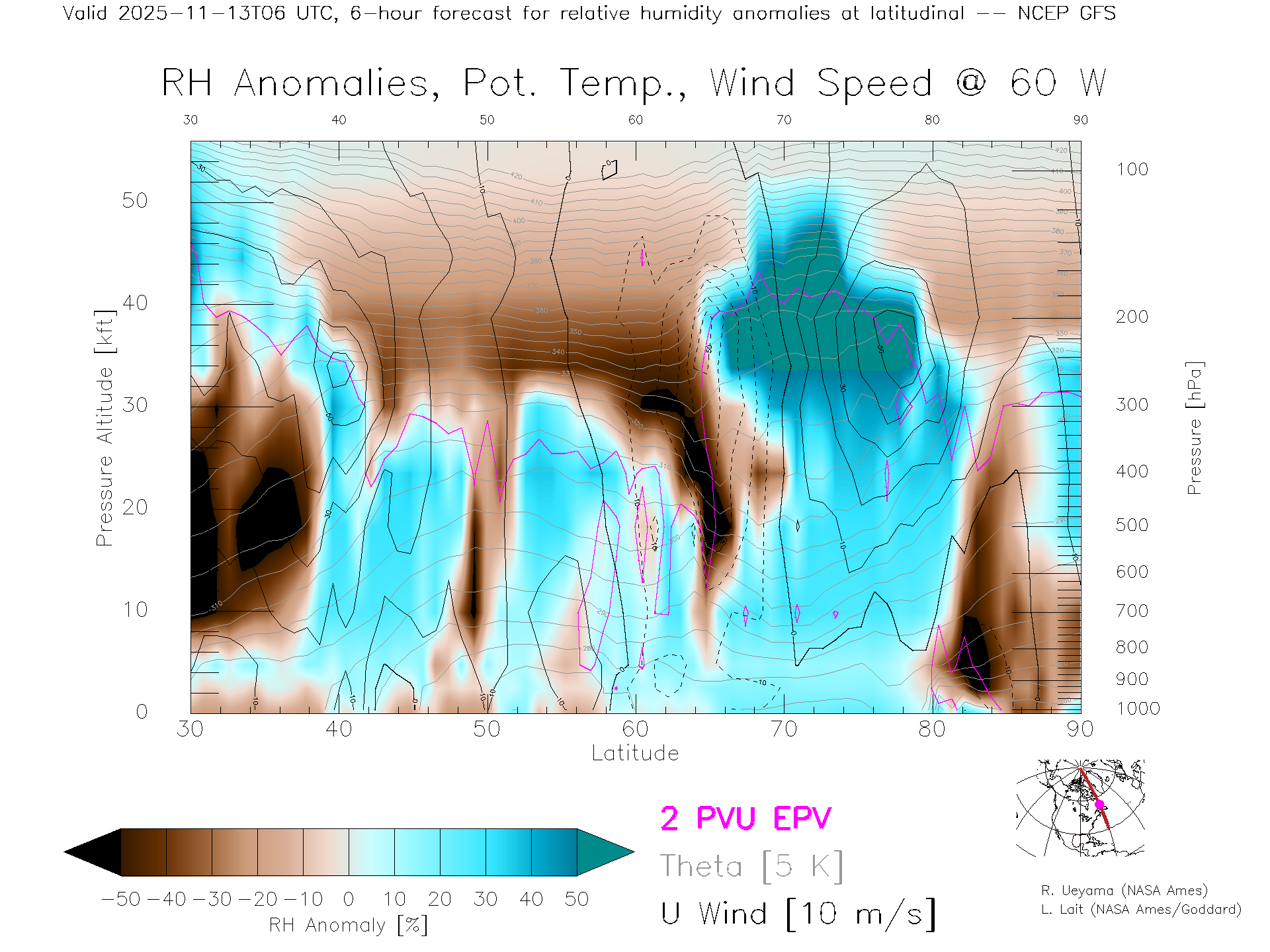 NCEP GFS Forecast Rel. Hum. X-Section (60 W)