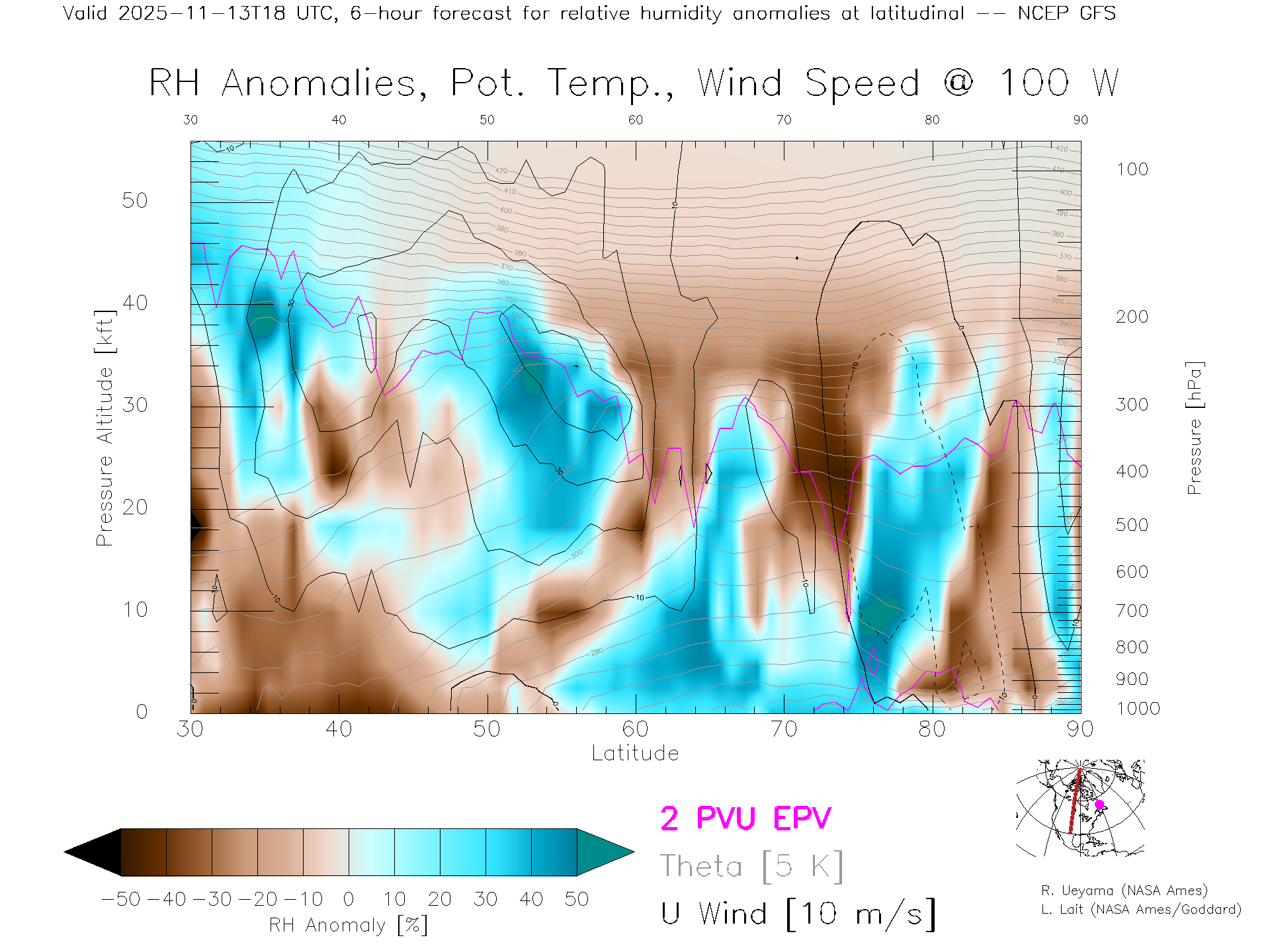 NCEP GFS Forecast Rel. Hum. X-Section (100 W)