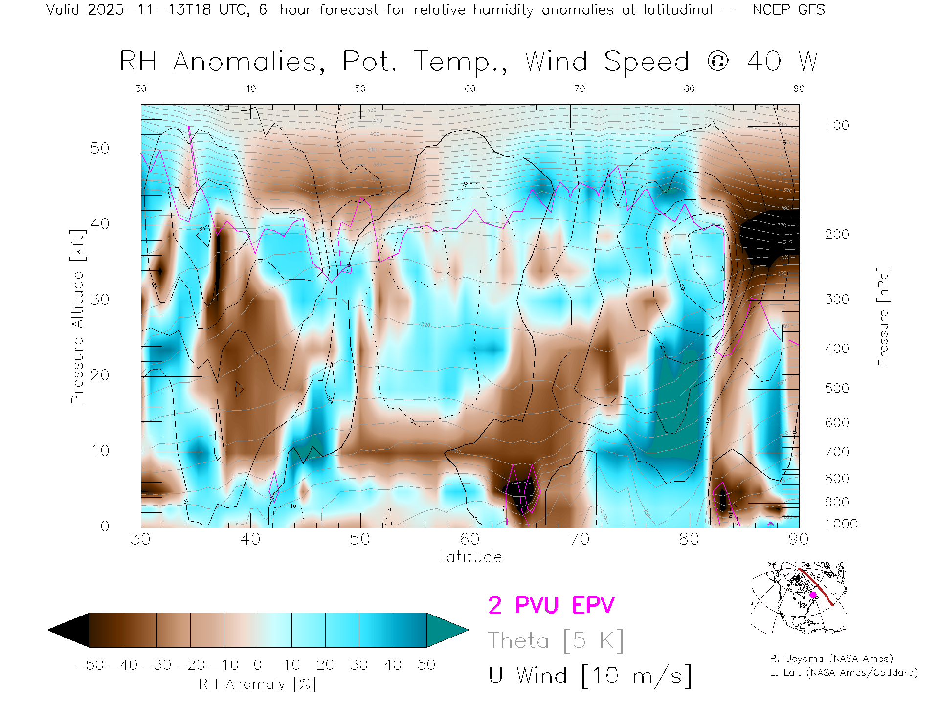 NCEP GFS Forecast Rel. Hum. X-Section (40 W)