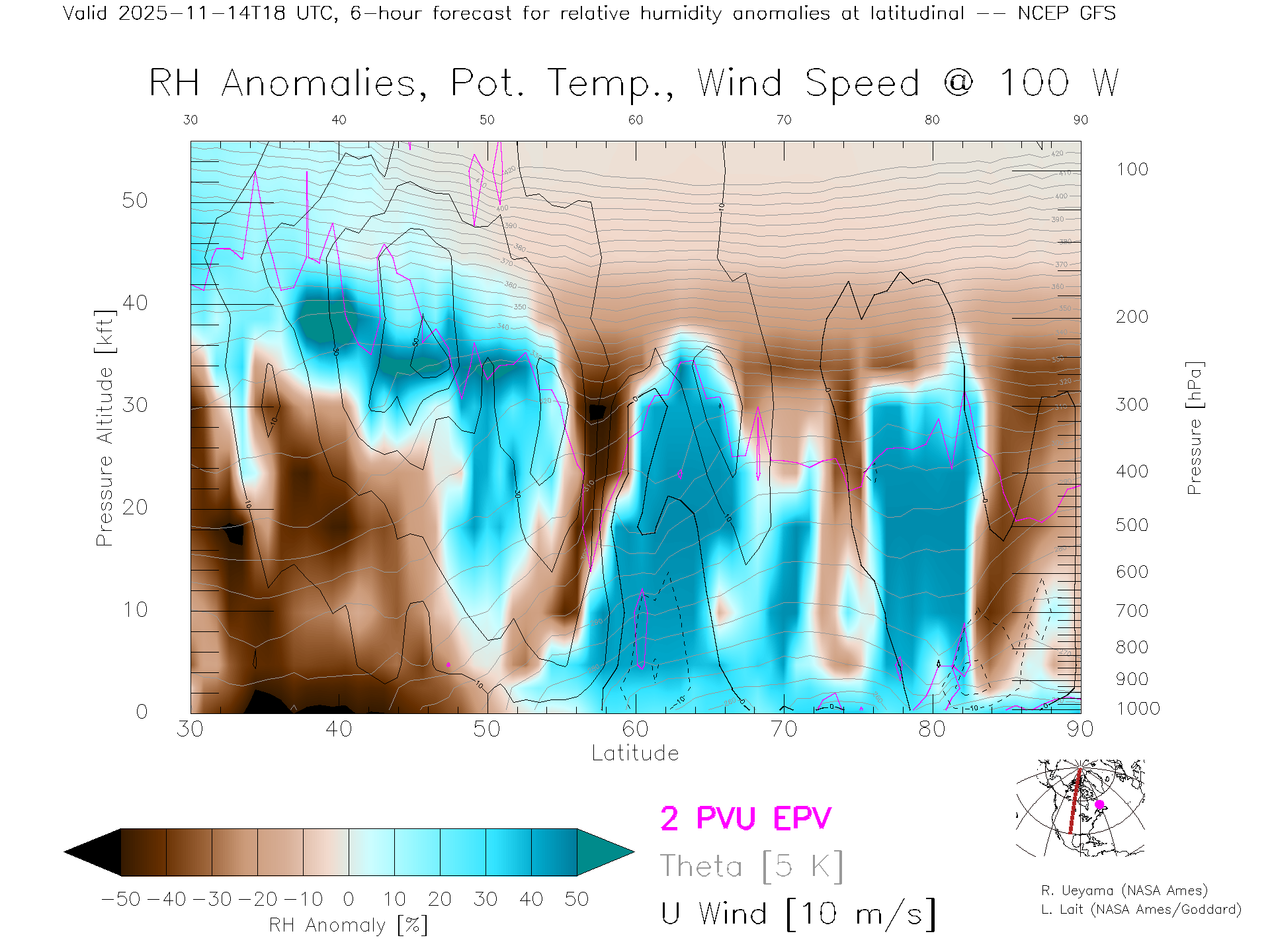 NCEP GFS Forecast Rel. Hum. X-Section (100 W)